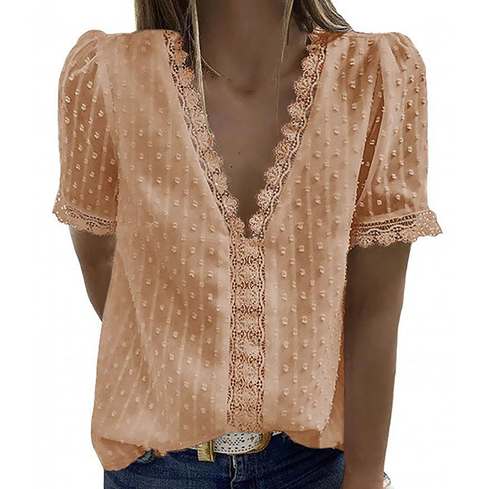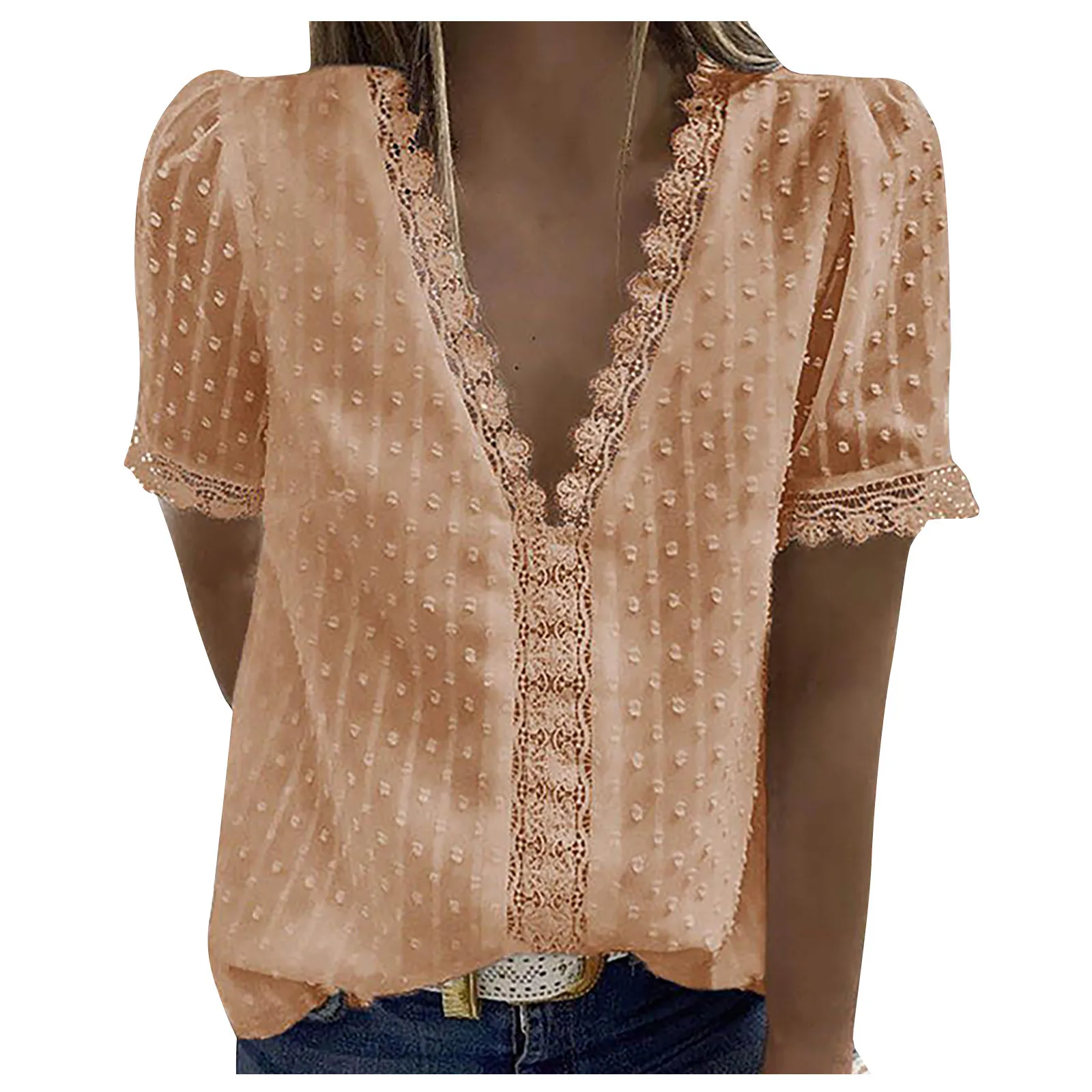 Женская модная кружевная Повседневная футболка с коротким рукавом, однотонный топ с V-образным вырезом