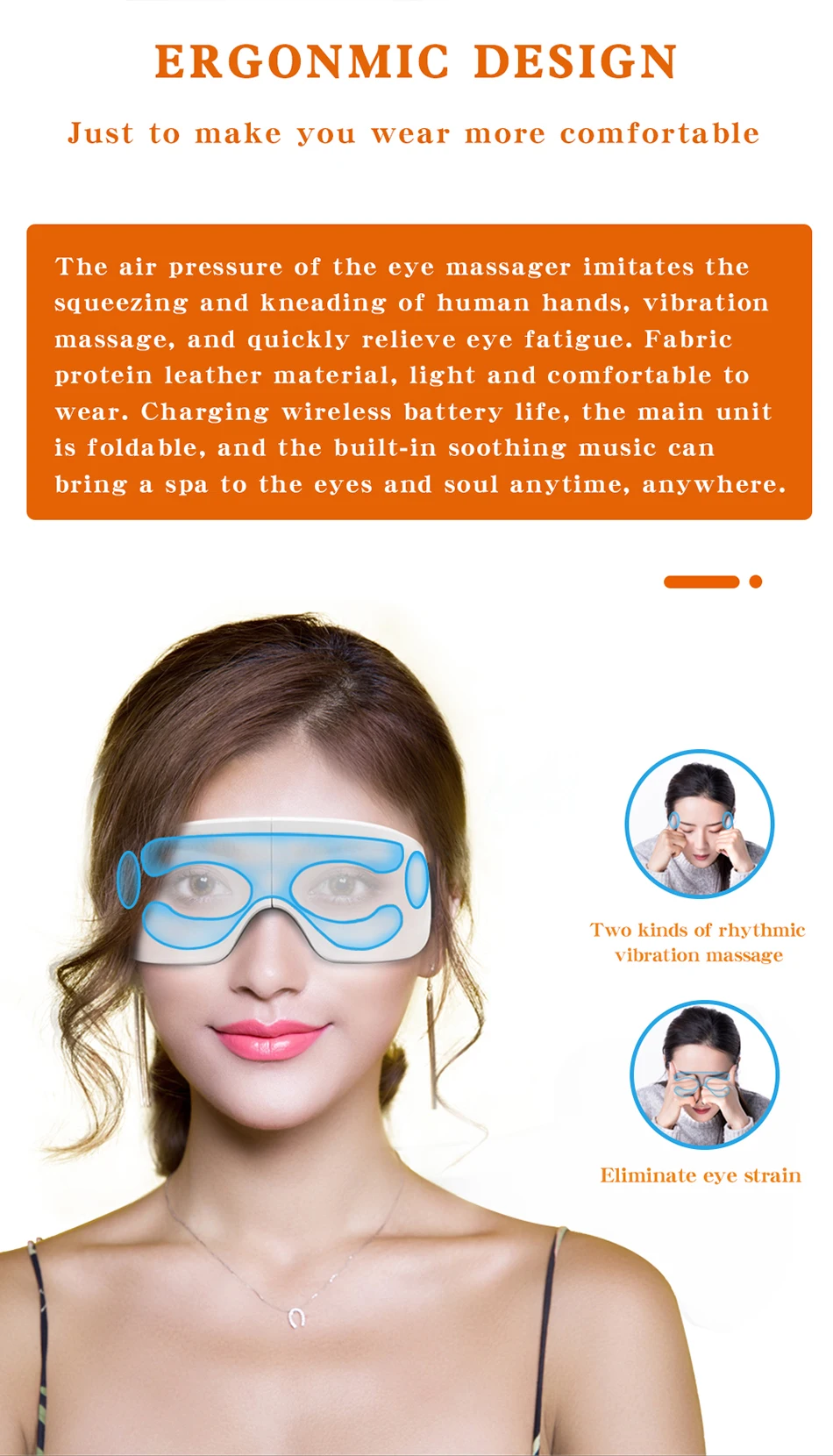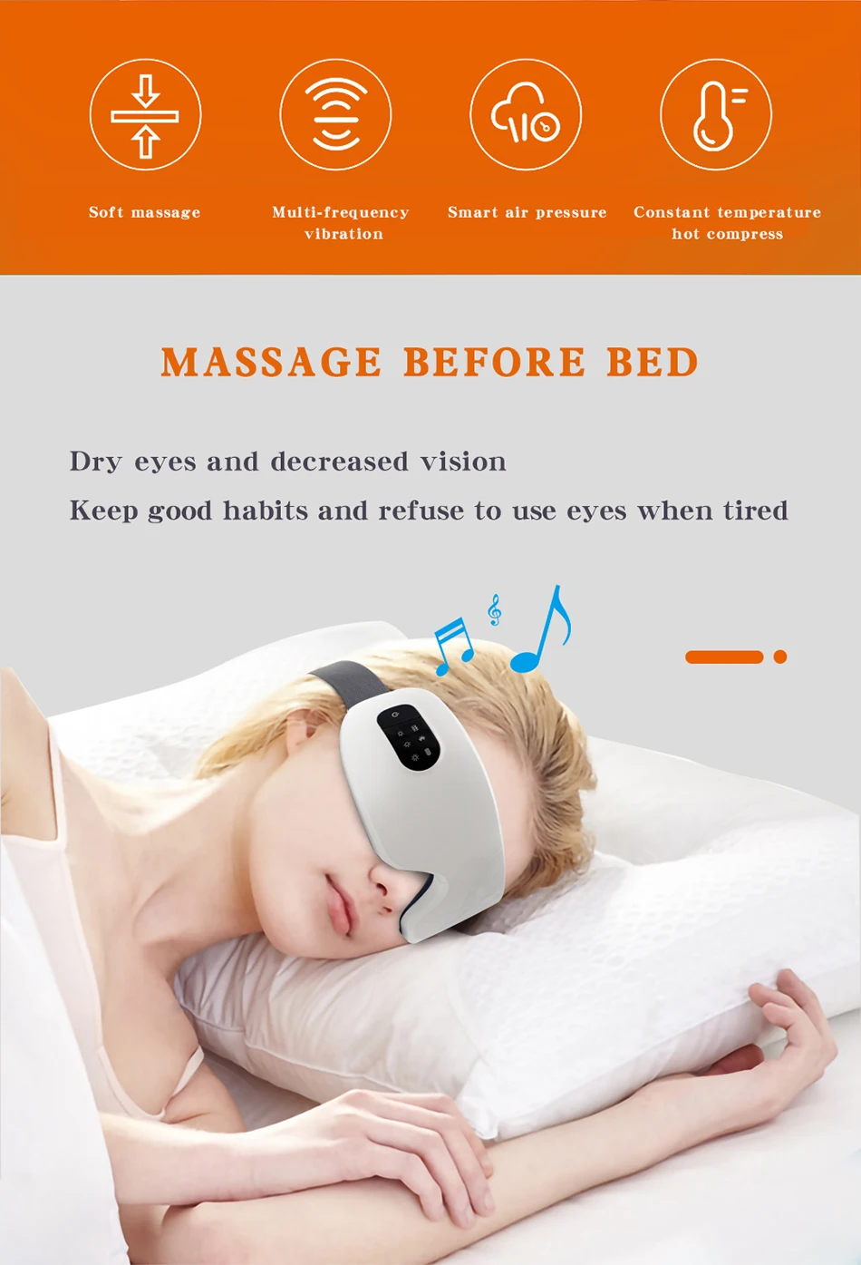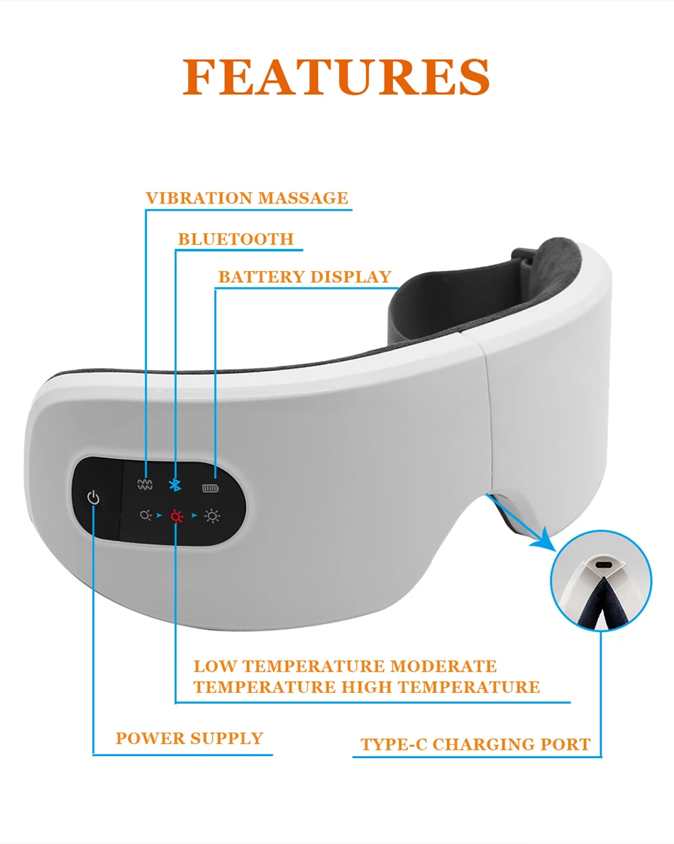 Советы:Этот S10-C массажер для глаз является основной моделью, произведенной нами, с четырьмя уровнями горячего сжатия, вибрационного массажа и музыки Bluetooth. Если вы хотите получить лучший опыт, пожалуйста, купите 8S- Airbag массажер для глаз