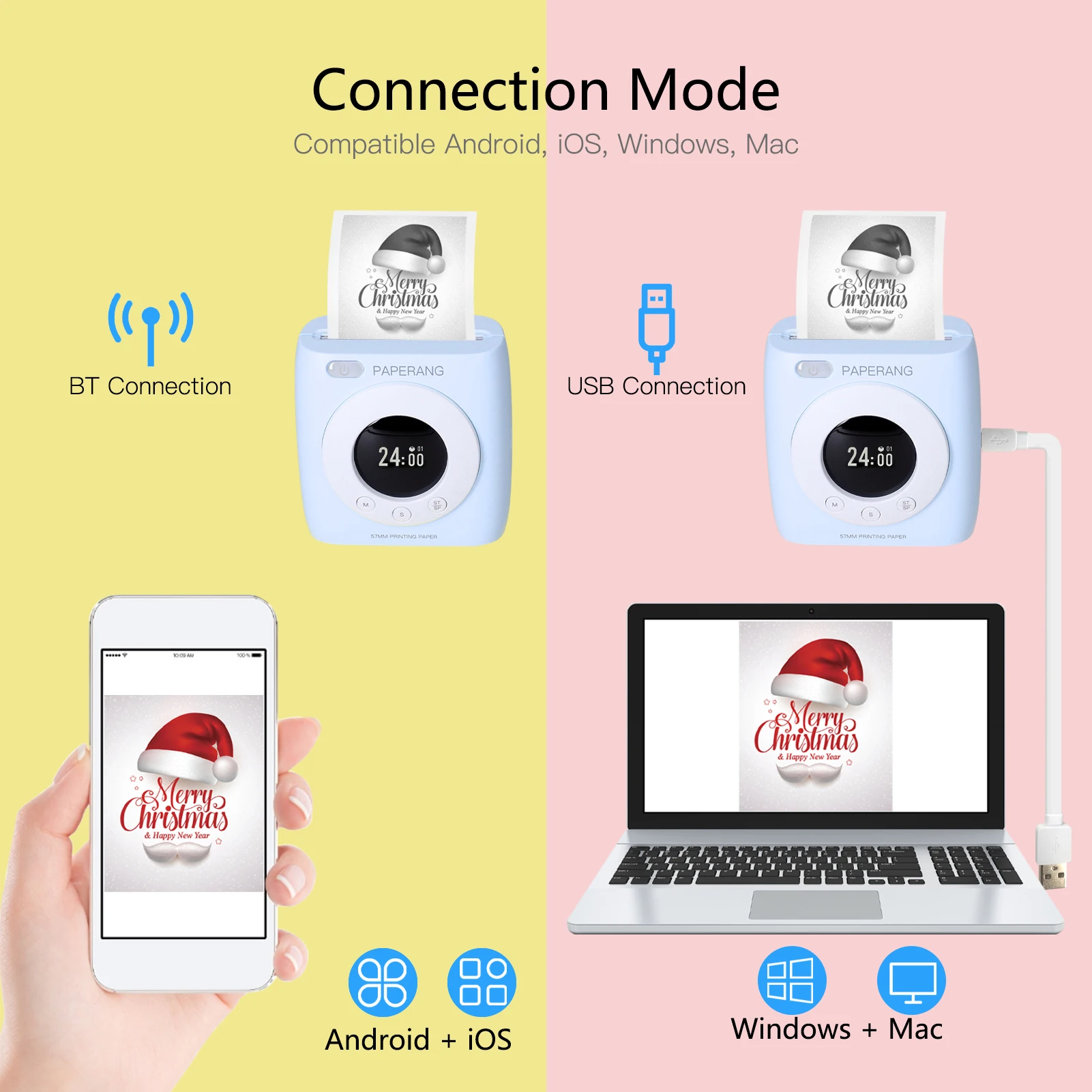 Беспроводное подключение:Поддержка беспроводного подключения BT с помощью приложения для смартфонов (PAPERANG), совместимого с Android и iOS, вы можете печатать в любое время и в любом месте. Также поддерживается подключение USB, Совместимо с Windows и Mac.