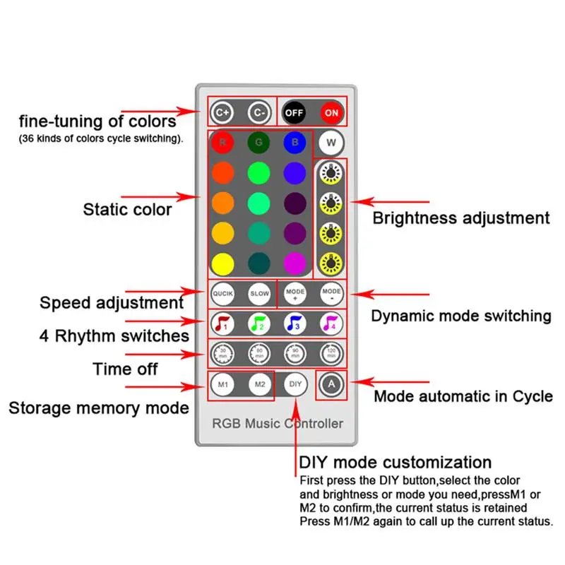 1 * рулон на расстоянии до 20 м несмонтированная плата зарядного устройства с световая полоса, 1 * Wi-Fi музыкальный контроллер, 1 * США сертифицированным источником питания, 1*40-ключ дистанционного управления, 2 * провода зажимы, 1 * Руководство, 1 * спиртовой лист, 1 * Двусторонняя лента