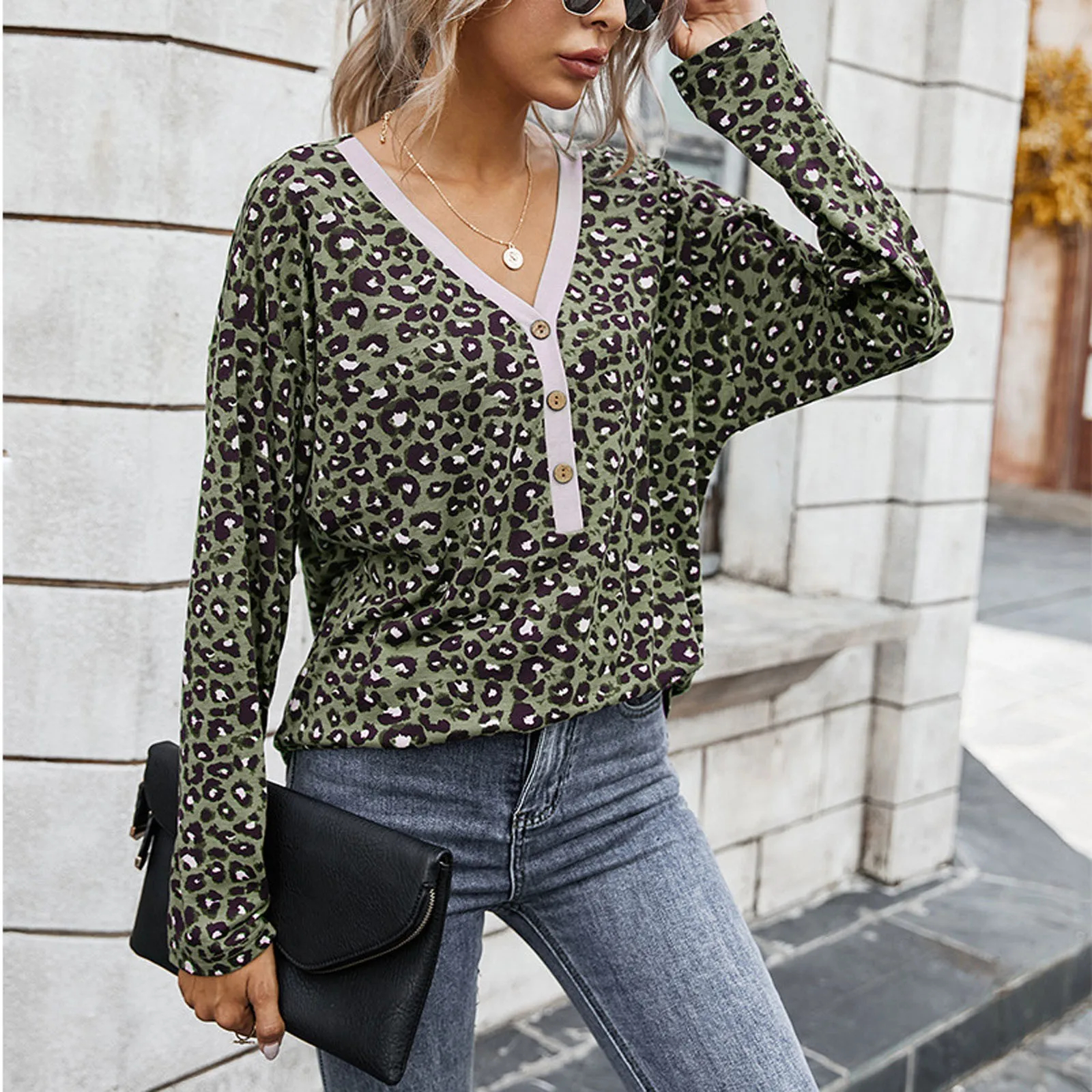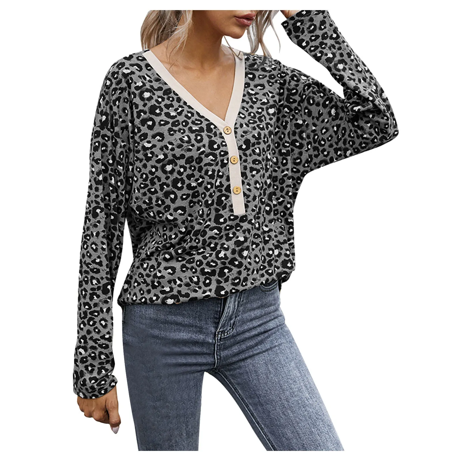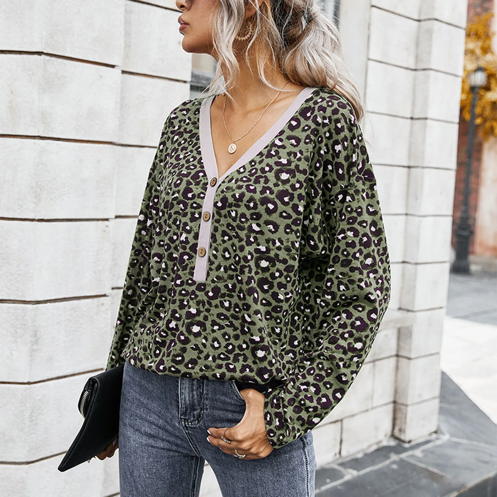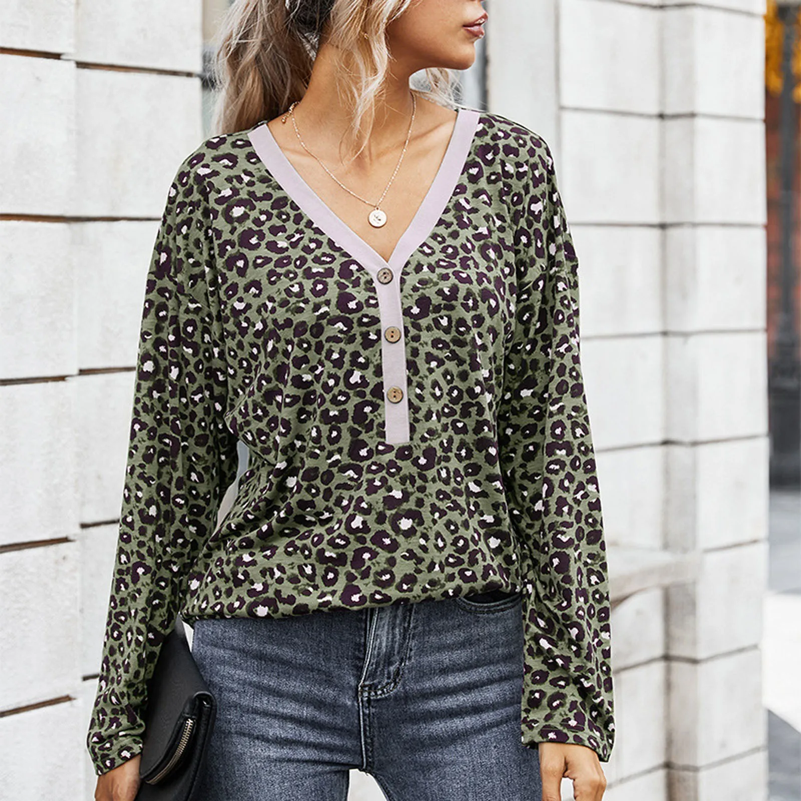 Женская модная трикотажная блузка с длинным рукавом и v-образным вырезом, топы с леопардовым принтом, свободные рубашки