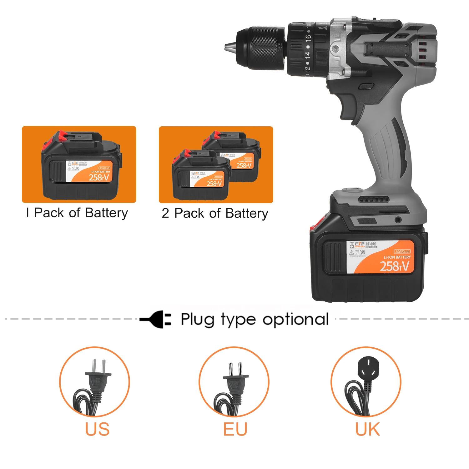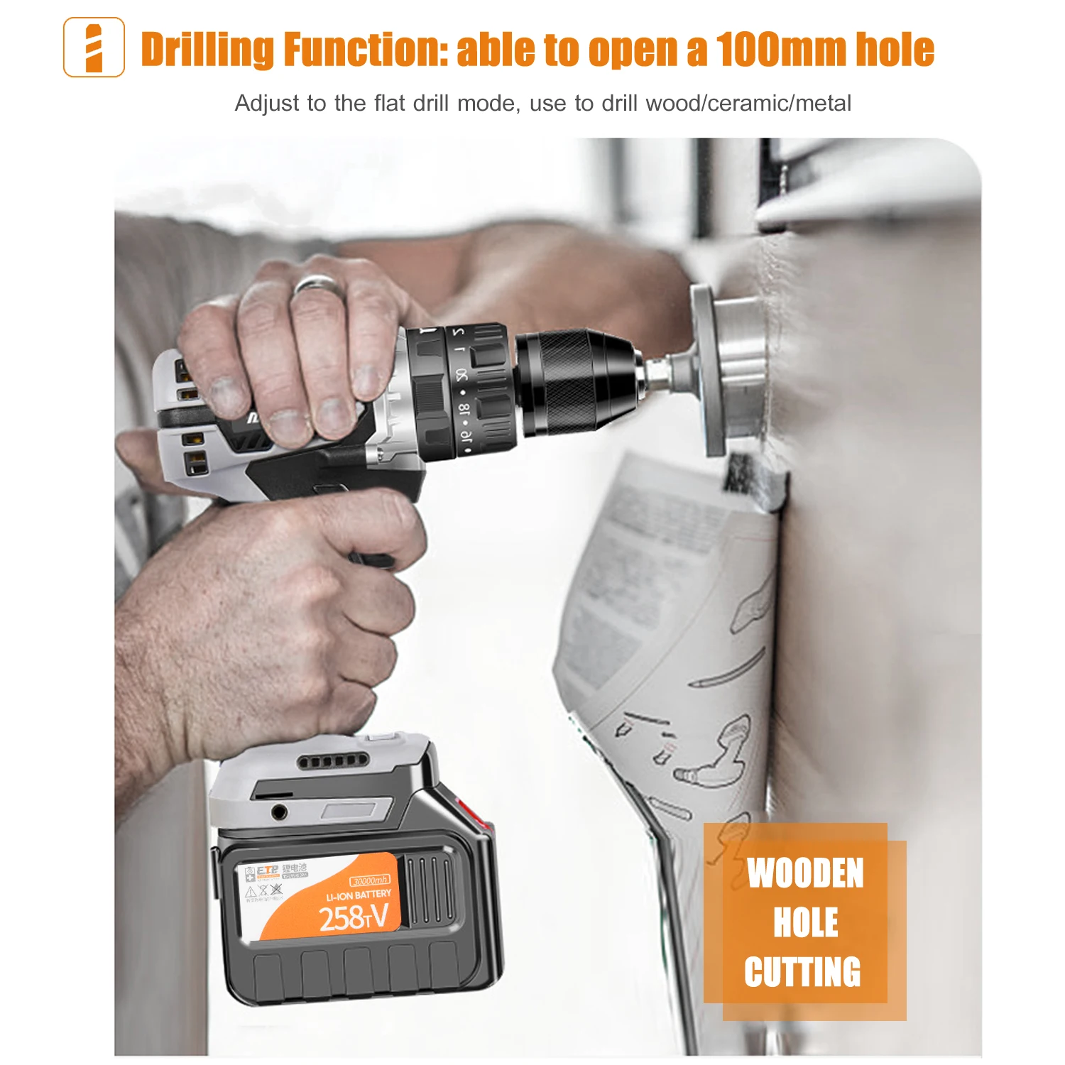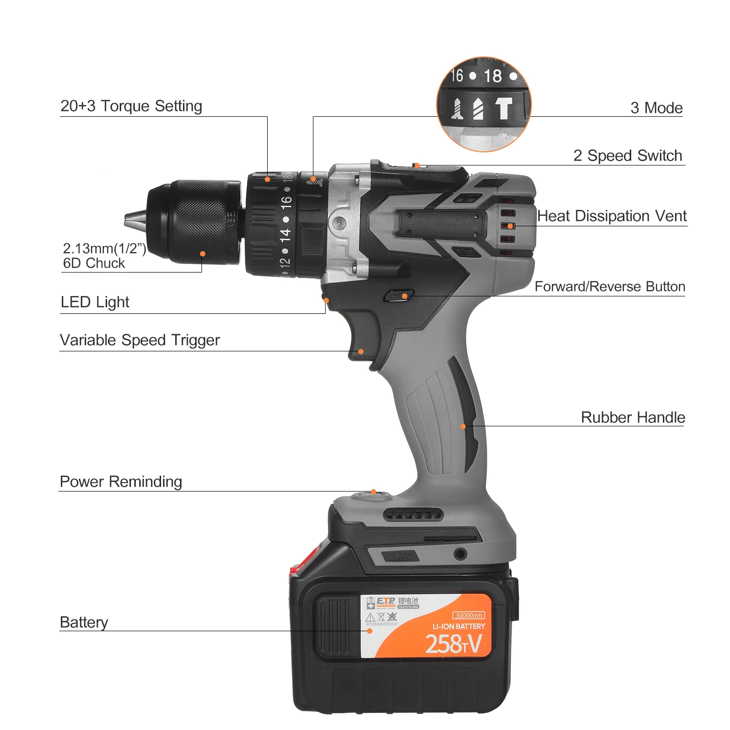 Аккумуляторная дрель промышленного класса с бесщеточным двигателем может обеспечить ударную мощность до 2655 нм (инф), что в 10 раз больше, чем у большинства дрелей на рынке. 2-скоростная дрель с 23 позициями сцепления для плоской дрели/отжима Kai/удара, переменная скорость, контролируемая различной силой нажатия, подходит для установки из цветной стали, сверления металла, открытие 100 мм большое отверстие для дерева и т. Д.