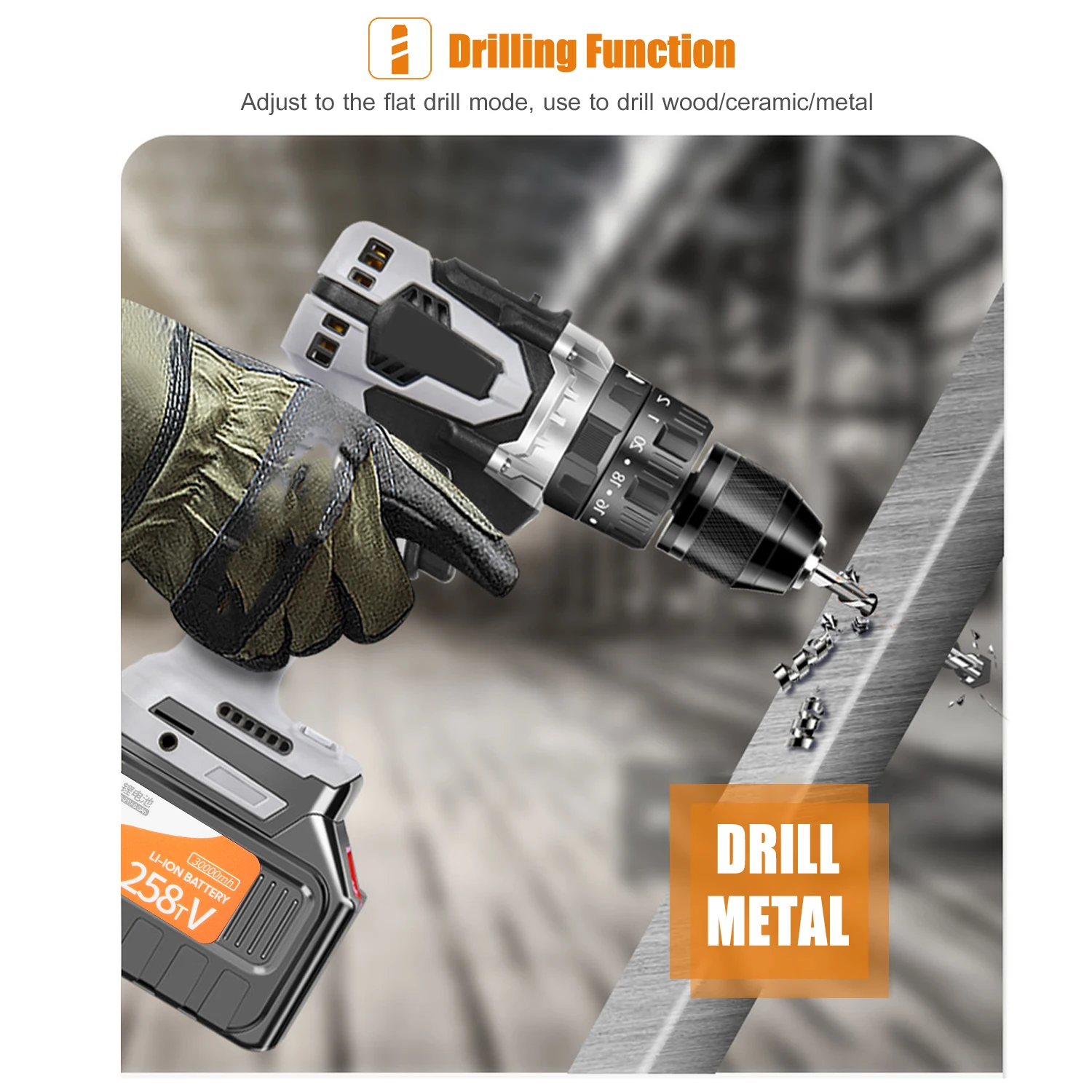 Цельнометаллический БЕСКЛЮЧЕВОЙ патрон 1/2 дюйма светодиодный светильник по сравнению с пластиковым патроном 3/8 дюйма, металлический храповый патрон без ключа с автоблокировкой 1/2 дюйма более стабилен и не падает и обеспечивает максимальную совместимость и долговечность аксессуаров. Спусковой светодиодный светильник в передней части дрели для повышенной видимости в закрытых рабочих пространствах и темной среде.
