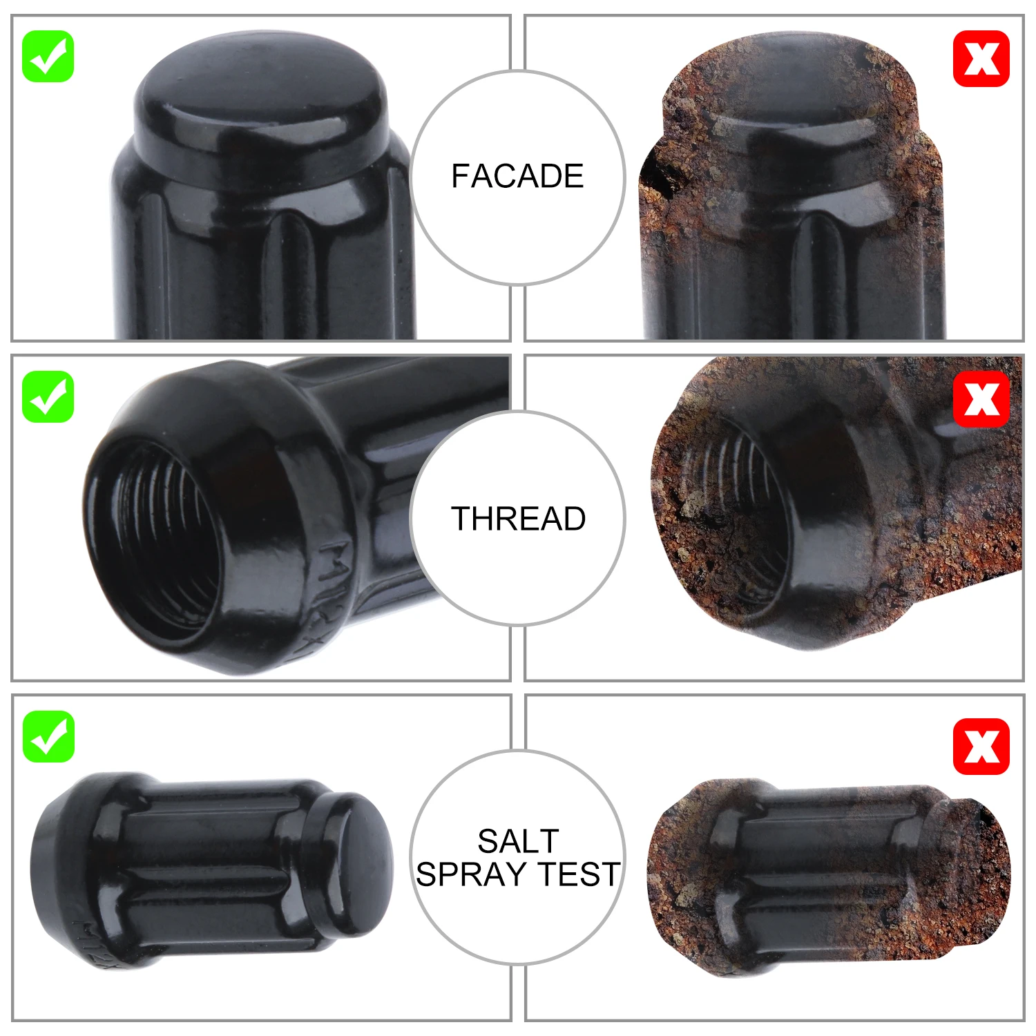 1. Количество: набор из 20 шт + 2 гнезда 2. Тип: 6 сплайнов, волнистый желудь, закрытый конец 3. Тип сиденья: Коническое сиденье 4. Шаг резьбы: 12x1,25 или 12 мм X1. 25 или M12x1.25 резьба 5. Гайка Высота: 1,4 дюймов или 35 мм 6. Привод (шестигранный размер): 3/4 "или 19 мм 7. Материал: сталь SCM 435 (Термообработанная) 8. Отделка: глянцевая черная отделка Особенности -Эти гайки изготовлены с высочайшим качеством, чтобы соответствовать или превышать стандарты OEM. -Применение одношаговой технологии холодной экструзии с высококачественной цельной углеродистой сталью. -Изготовлен из закаленной стали SCM 435 с хромированным покрытием. -Термообработанное покрытие предотвращает окисление и защищает сталь. -Тонкий сплайсиновый привод идеально подходит для колес с отверстиями небольшого диаметра. -Вы можете спокойно отдохнуть, что наш инструмент с тонкостенными гнездами действует как ключ, который добавляет слой безопасности против возможных воров колес. Обработка поверхности -Многослойный никель (светильник из никеля + высокосернистого никеля + полный светильник из никеля + микропористого никеля), отличная стойкость к ржавчине. -Один слой непрозрачного хрома, очень прочный и долговечный. -Один слой чистого электрофоретического покрытия, отличная устойчивость к царапинам. -Время сопротивления CASS составляет 72 часа. -Время сопротивления NSS составляет 120h без белой коррозии и 240h без красной коррозии.