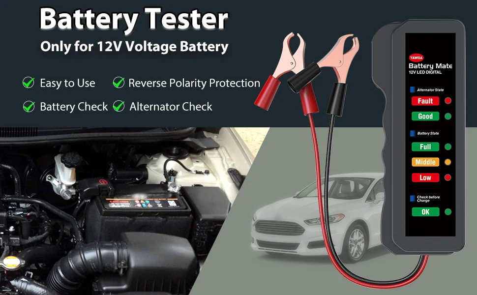 [Тестер аккумулятора 12 В] тестер автомобильного аккумулятора предназначен для всех систем зарядки 12 В, включая обычные Затопленные, плоские пластины AGM, спиральные и Гелевые аккумуляторы AGM для транспортных средств, вилочных погрузчиков, гибридных автомобилей, внедорожники, пикапы, лодки, внедорожники, мотоциклы, туристические прицепы.