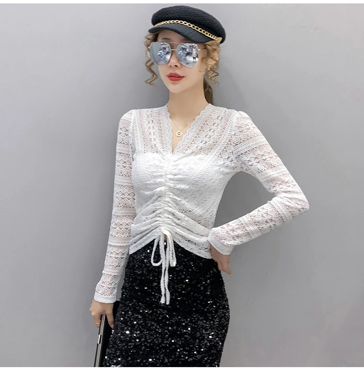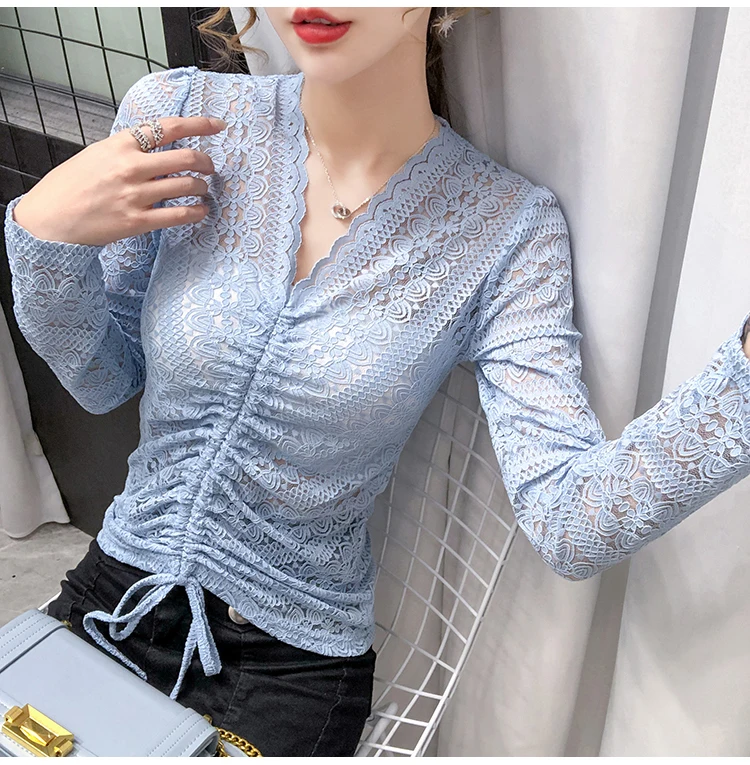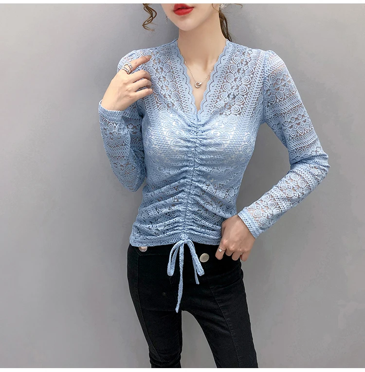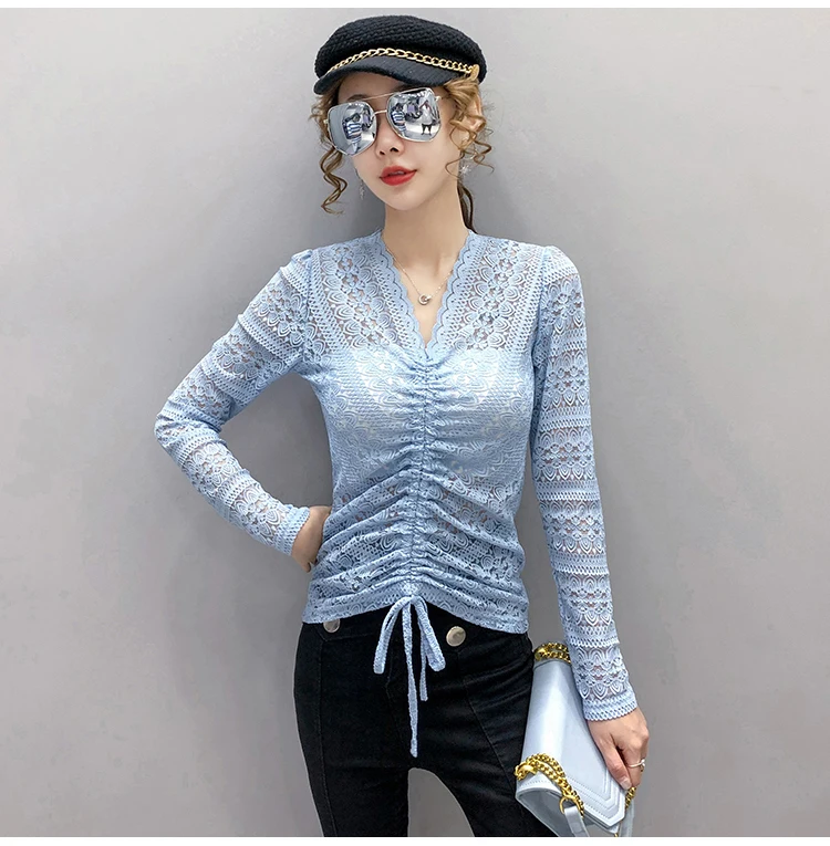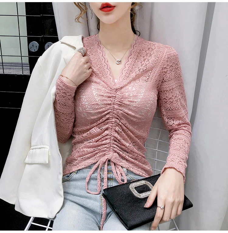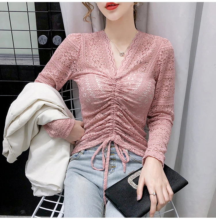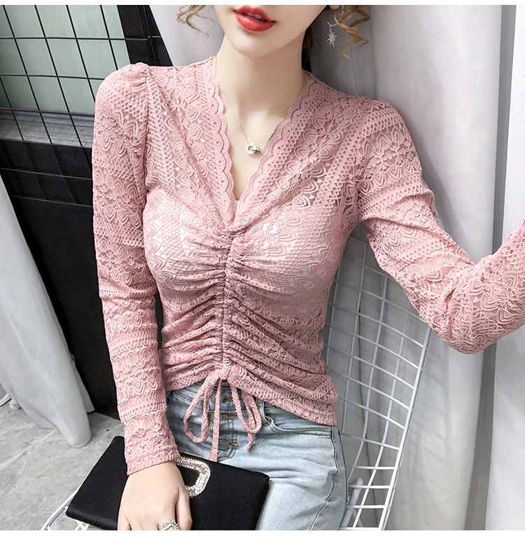 Женская ажурная кружевная блузка TingYiLi, весенний Топ с длинным рукавом и v-образным вырезом, черный, белый, розовый, синий
