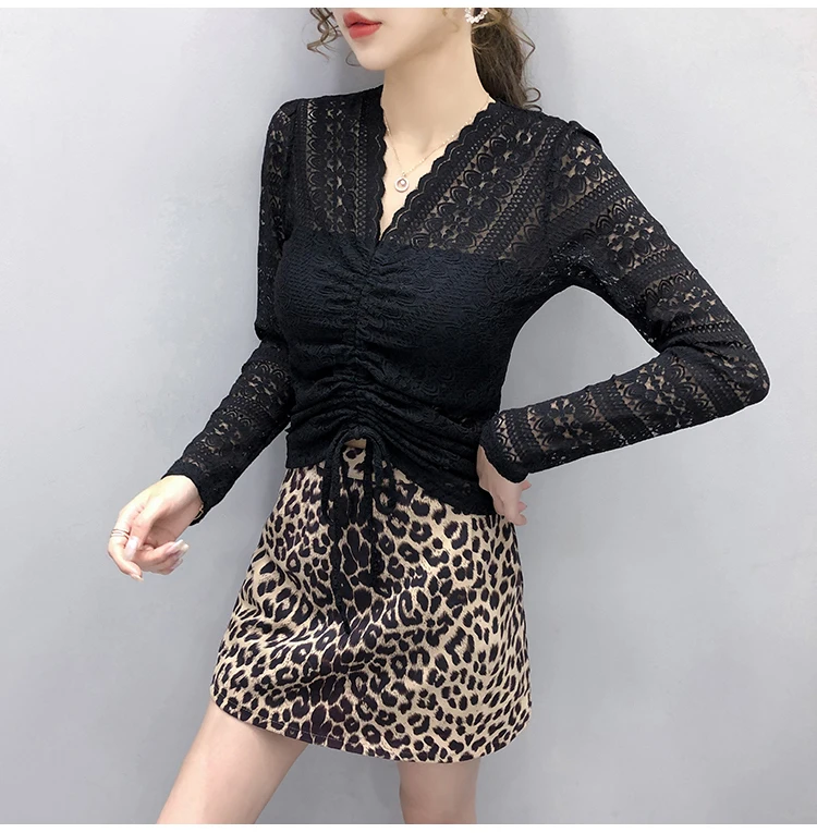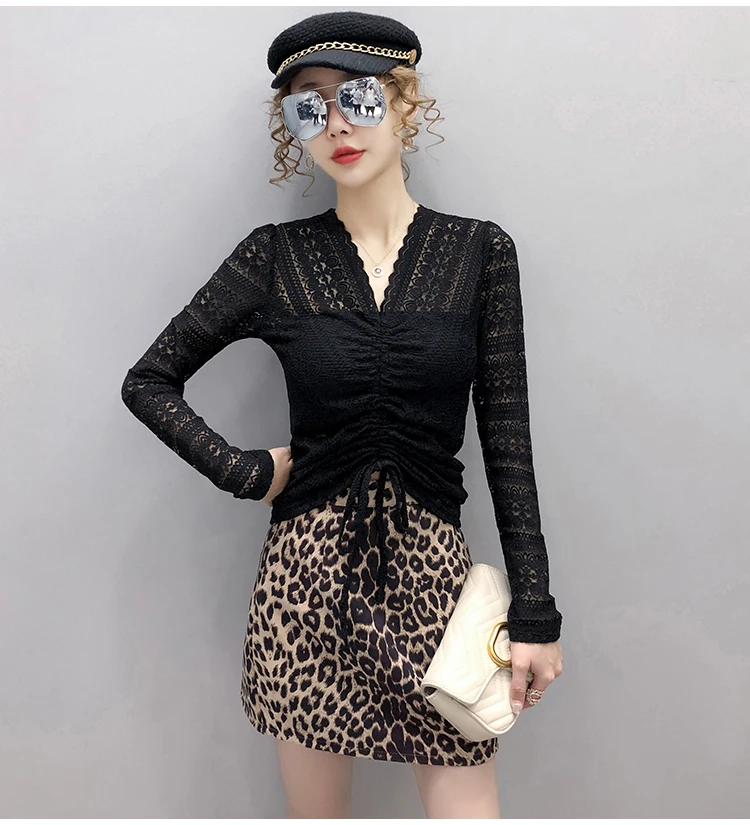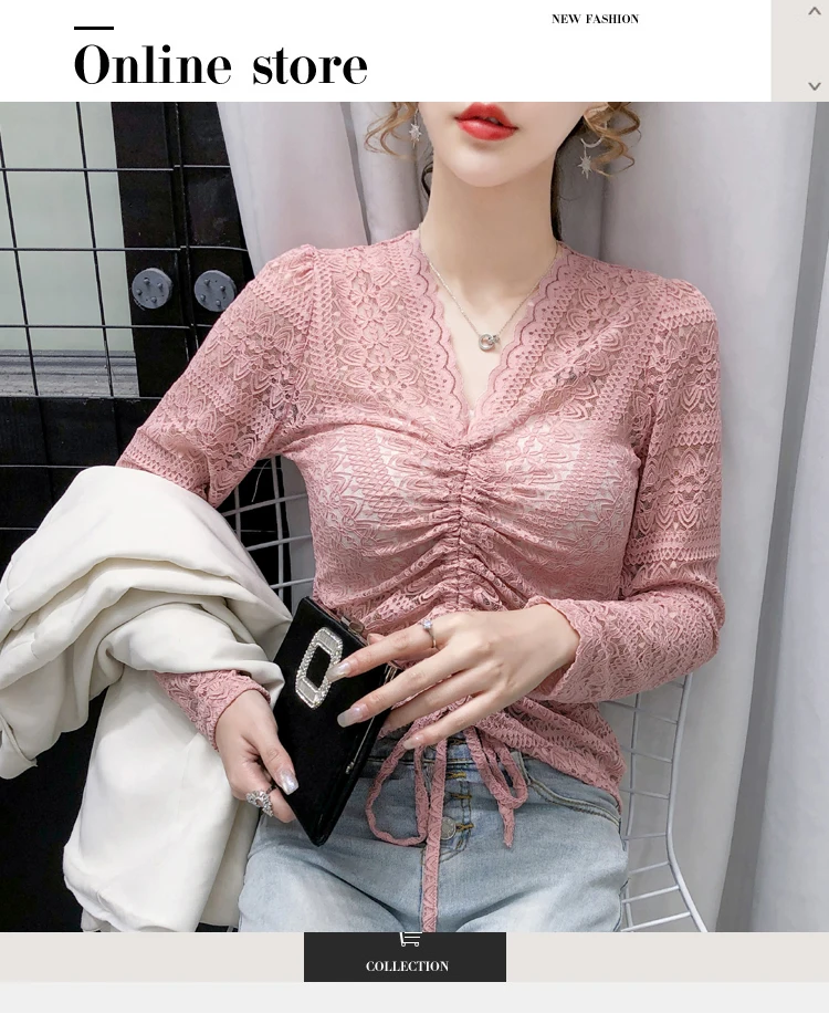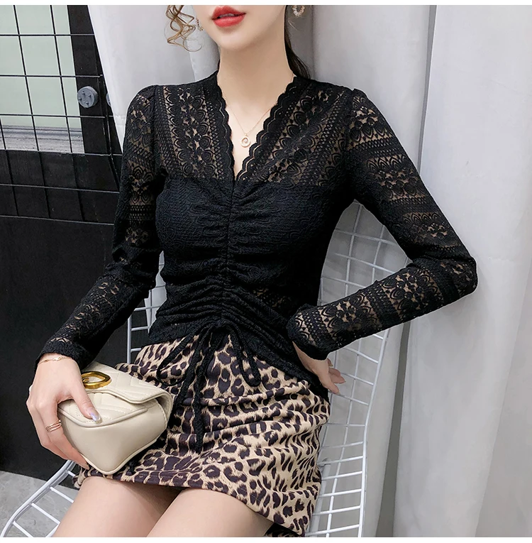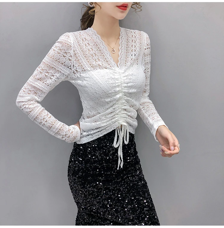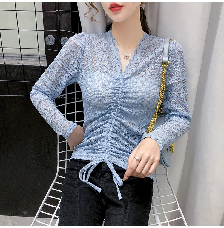 Женская ажурная кружевная блузка TingYiLi, весенний Топ с длинным рукавом и v-образным вырезом, черный, белый, розовый, синий