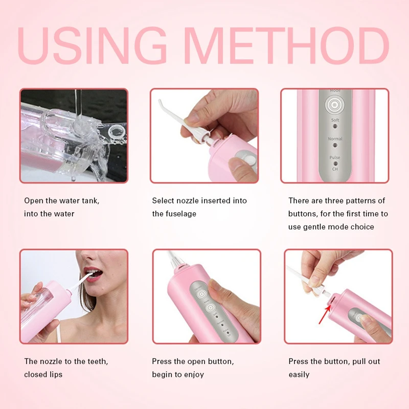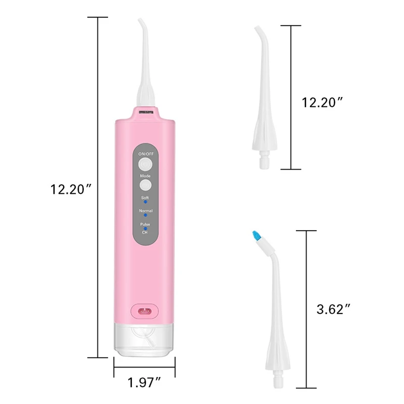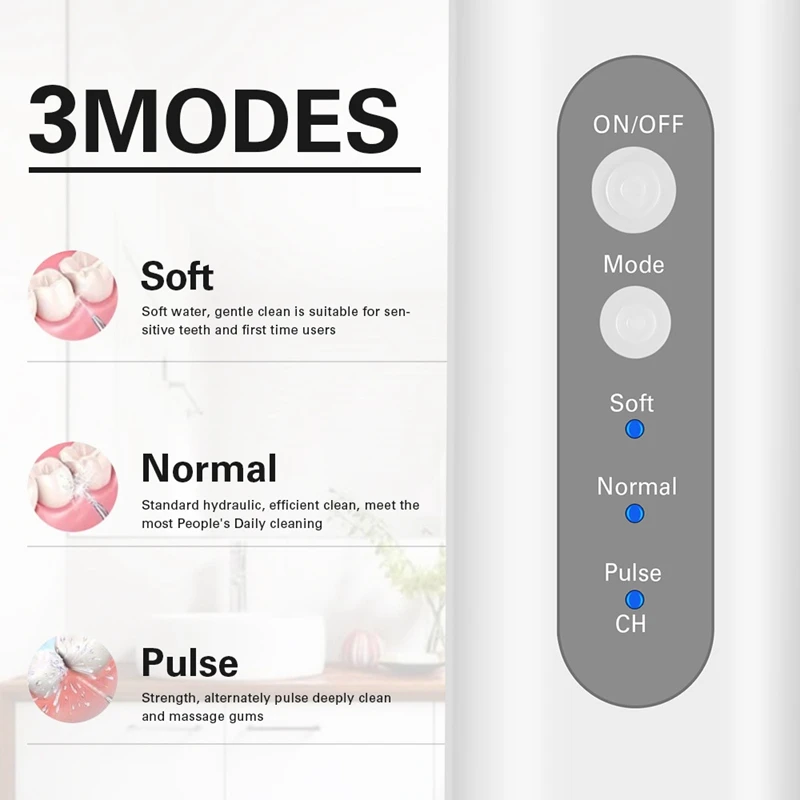 3 переключаемых режима и 2 сменных печатающих головки. Вращающийся на 360 ° распылитель может легко очистить все зубы пространства, различные распылительные головки имеют свой собственный эффект очистки, роль гораздо больше, чем зубная щетка