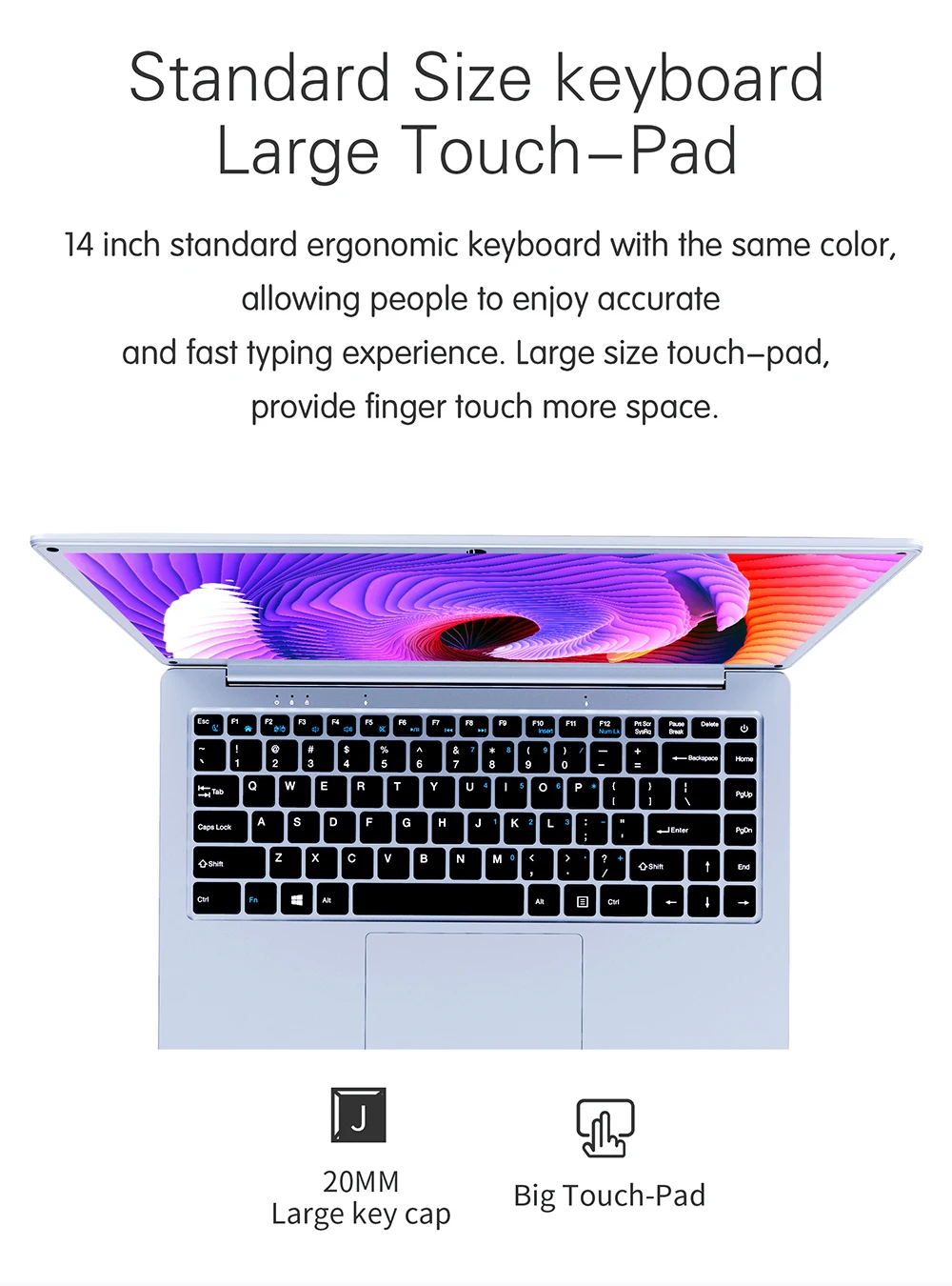 14 дюймов стандартный эргономичная клавиатура с один и тот же цвет, что позволяет наслаждаться точный и быстрый ввод текста. Большой размер сенсорной панели, обеспечивает палец касания больше места.