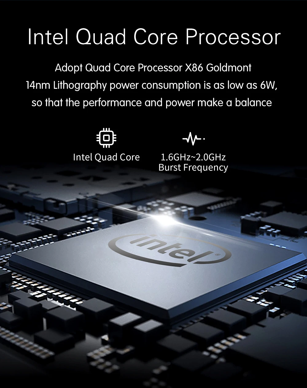 Принять четырехъядерный процессор X86 Goldmont ,14 м литография Потребляемая мощность составляет 6 Вт, так что производительность и мощность делают баланс