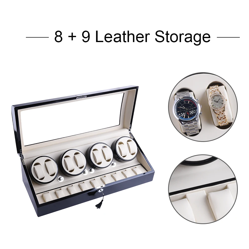 【Большой емкости 】 коробка для намотки часов с 8 шагами для намотки плюс 9 мест для хранения, чтобы собрать любимые часы. Компактный и изысканный дизайн позволяет устранить трение и избежать царапин между часами. Высококачественный замок для безопасности ваших часов.