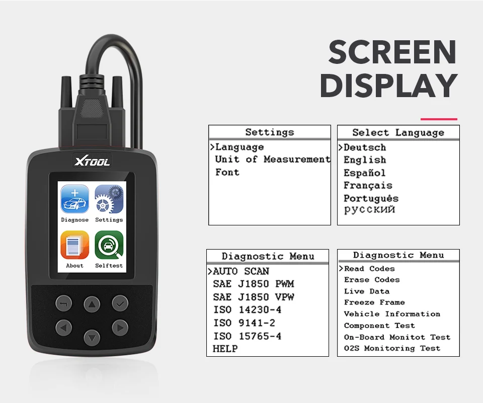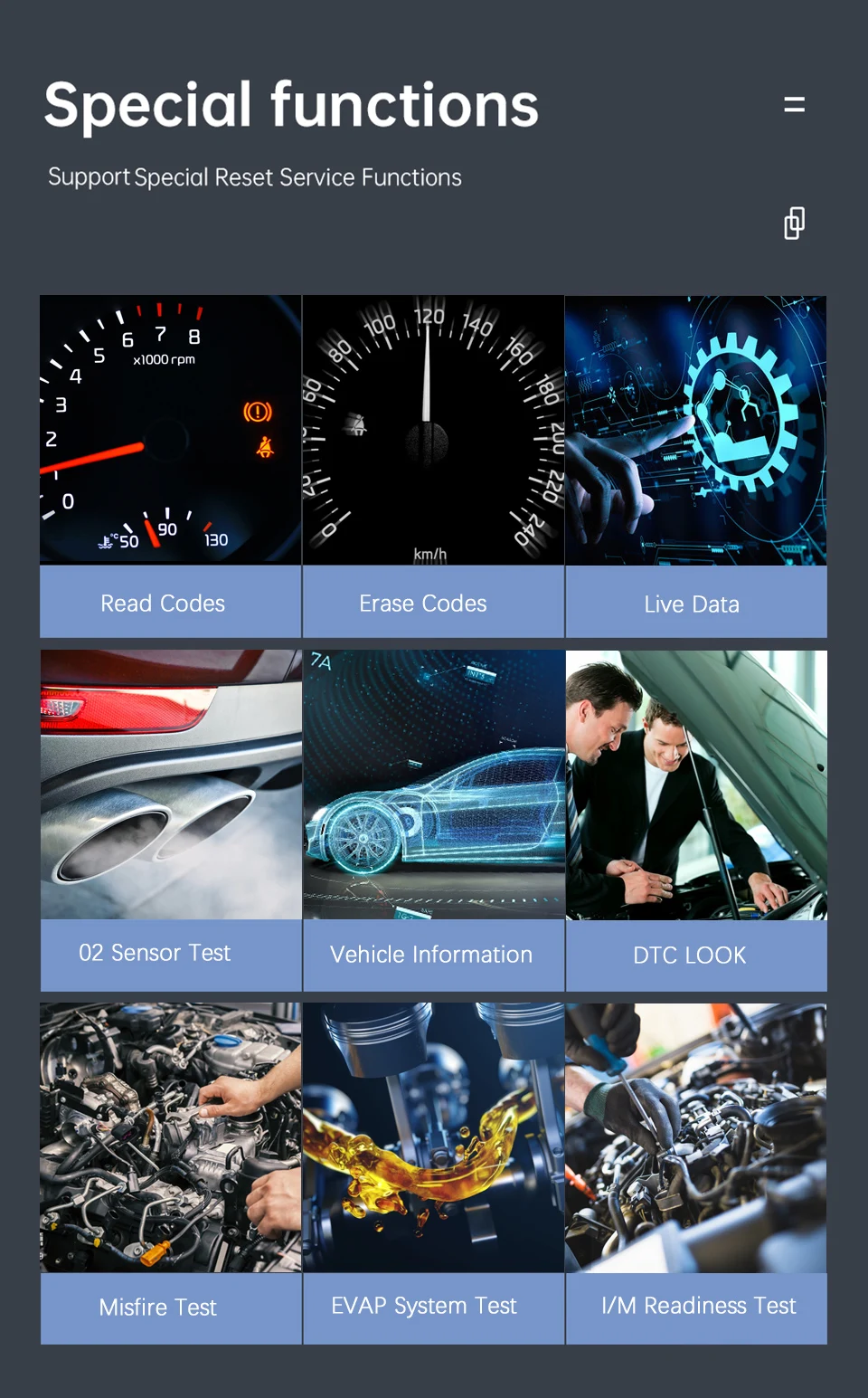 1. Поддержка всех диагностических функций OBD2: считывание кодов, стирание кодов, I/M готов, просмотр потока данных, замораживание кадра, Тест датчика O2, бортовой тест монитора, тест Системы EVAP, информация о транспортном средстве, поиск DTC