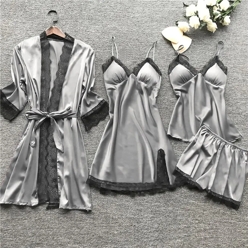 Женские пижамные комплекты, атласная пижама из шелка, 4 предмета, пижама на тонких бретелях, кружевная Пижама для сна с нагрудными накладками, 2019.
