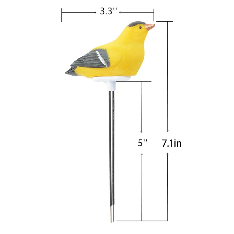После удаления прозрачной пленки за сиденьем птицы батарея будет электрифицирована. Если вы хотите выключить функцию пения, нажмите два зонда одновременно или вставьте зонды в самую влажную почву.