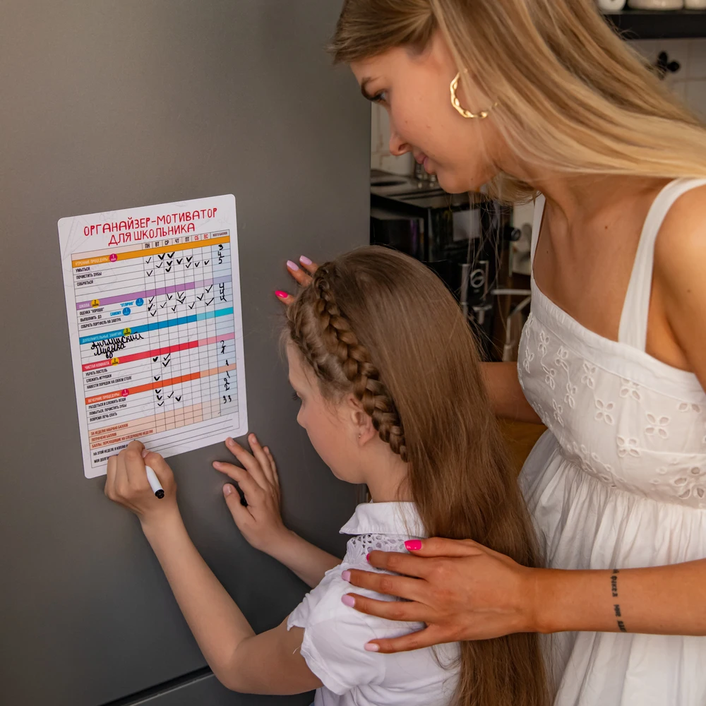 Магнитное расписание уроков - полезный подарок для девочек и мальчиков, незаменимый помощник в учебе и развитии детей. Магнитный планер позволит школьнику быть результативнее и эффективно планировать свое время на предстоящую неделю. Магнитное расписание на холодильник дает возможность зафиксировать время занятий по часам, а также прописать дополнительные уроки и кружки. Ваш ребенок сможет заранее планировать выполнение домашних заданий, чтобы освободить как можно больше времени для досуга. Магнитный планинг имеет многоразовую поверхность пиши-стирай. В комплекте идет специальный маркер чёрного или синего цвета, который легко удаляется с поверхности, а также имеет губку и встроенный магнит. Магнитный планировщик выполнен из высококачественного винила, с красочной и износостойкой печатью. Планер Расписание уроков легко крепится на холодильник, магнитную доску или его можно положить на стол. Посмотрите всю нашу продукцию, для этого наберите в поисковой строке Notta & Belle.