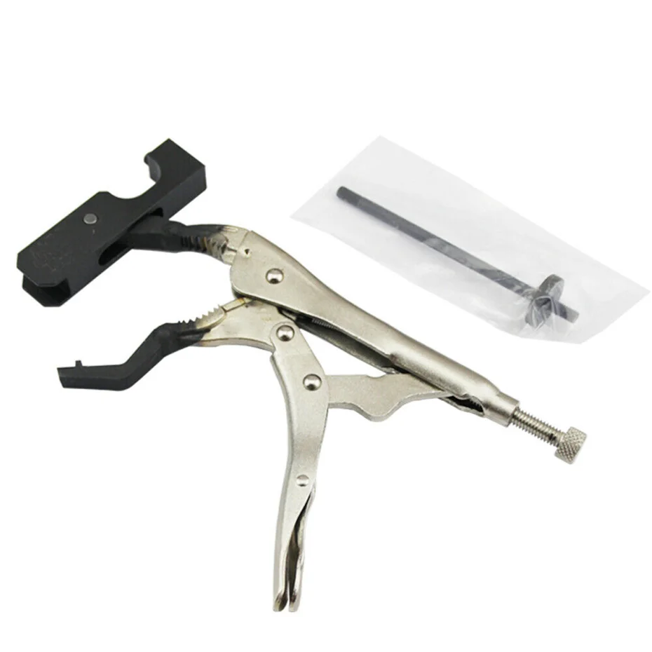 -Before remove the spring, fixed this tool in the positioned plate and loosen the bolt. -Open this tool carefully, unloaded the spring and take it off. -Close this tool to tighten the spring while installing it. To match the bolt to hole, and locked. -Applicable: BMW N42 / N46