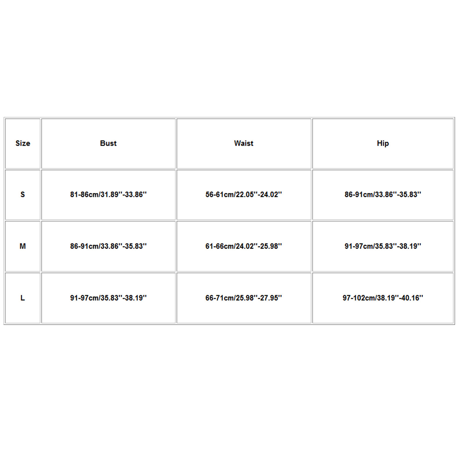 Размер Бюст Талия Бедра S 81-86 см/31,89 ''-33,86'' 56-61 см/22,05 ''-24,02'' 86-91 см/33,86 ''-35,83'' М 86-91 см/33,86 ''-35,83'' 61-66 см/24,02 ''-25,98'' 91-97 см/35,83 ''-38,19'' L 91-97 см/35,83 ''-38,19'' 66-71 см/25,98 ''-27,95'' 97-102 см/38,19 ''-40,16''