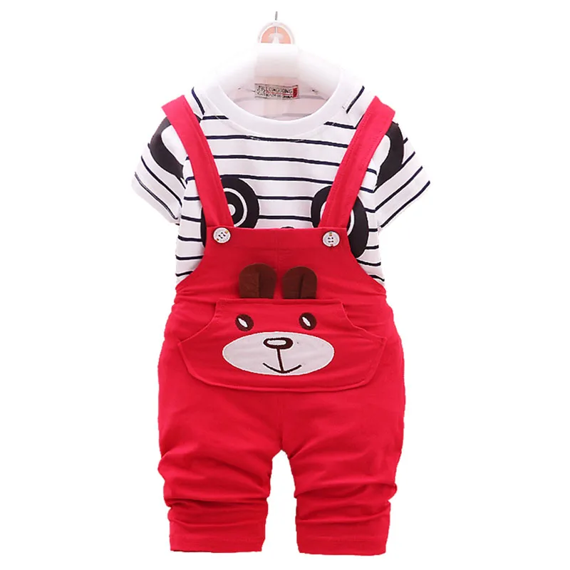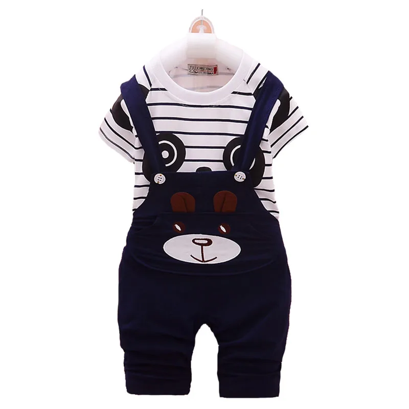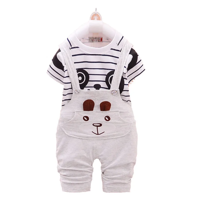 От 1 до 4 лет летняя одежда для мальчиков и девочек комплект из двух предметов, футболка в полоску с короткими рукавами и рисунком + штаны на бретелях качественная одежда
