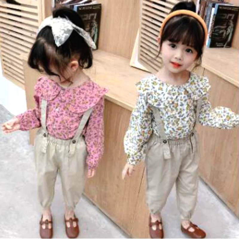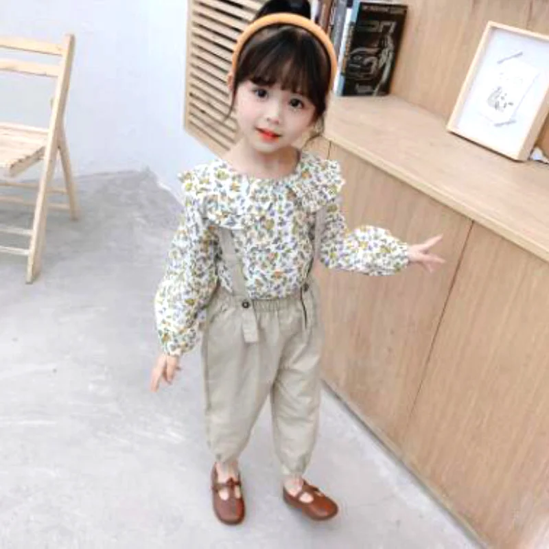 От 1 до 4 лет Одежда для девочек летний комплект из двух предметов, модная куртка с длинными рукавами и цветочным рисунком + однотонные повседневные штаны на бретелях Качественная детская одежда