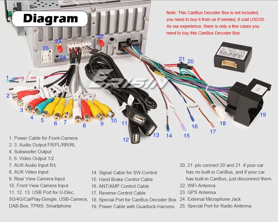 -Функция: может быть подключен к U-Disc, 3G/4G Dongle, CarPlay Dongle, TPMS-устройству, DVR-камере, DAB + Box, смартфону и т. д.