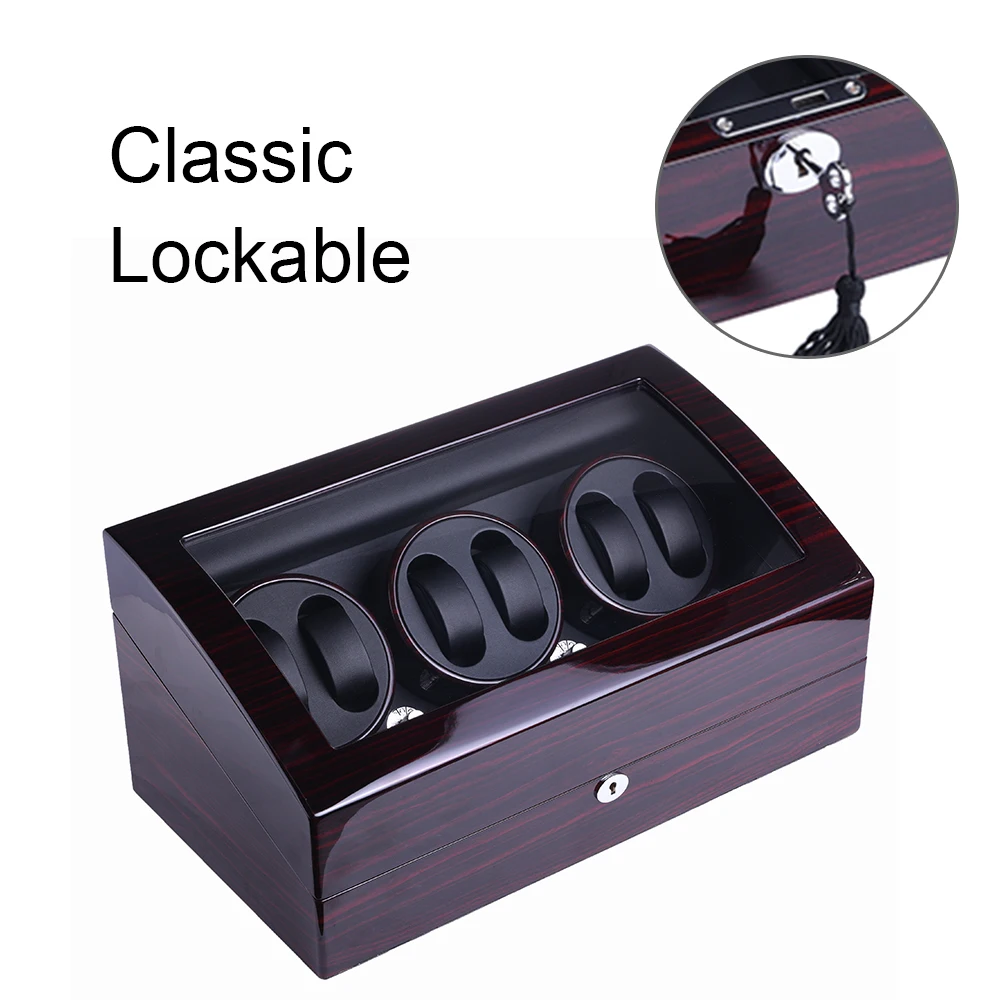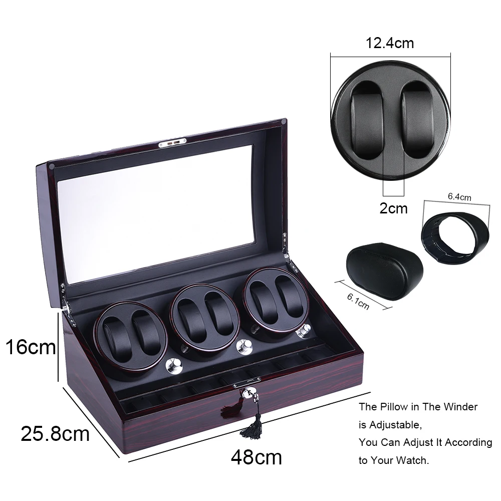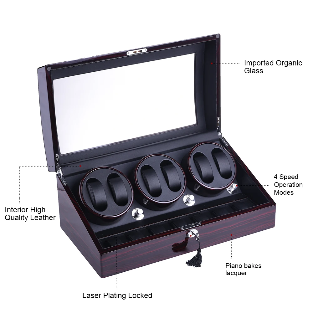 【High Quality Material】: This watch winders is 100% Handmade of natural wooden and high grade piano lacque, use PU interior, clear organic glass cover protects your watch dust free.