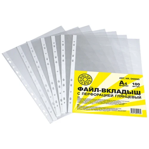 - файлы-вкладыши DOLCE COSTO Эконом глянцевые выполнены из высококачественной полипропиленовой пленки толщиной 0,020 мм, снабжены универсальной перфорацией, предназначены для хранения и транспортировки неперфорированных документов. Размер файла 233+/-2 х 305+/-2 мм