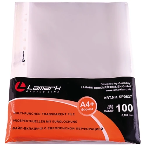 - файлы-вкладыши Lamark А4+ повышенной вместимости премиум класса выполнены из высококачественной полипропиленовой пленки толщиной 0,100 мм с фактурой поверхности “квадрат”, снабжены универсальной перфорацией, предназначены для хранения и транспортировки неперфорированных документов