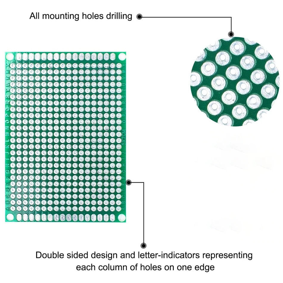 Package List 1pcs 4X6CM double-sided PCB board with 280 holes 1pcs 3X7CM double-sided PCB board with 240 holes 1pcs 5X7CM double-sided PCB board with 432 holes 1pcs 2 X 8CM double-sided PCB board with 168 holes 1pcs 7 X 9CM double-sided PCB board with 806 holes
