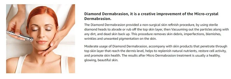 ● Microdermabrasion is a non-invasive, skin resurfacing procedure that gently exfoliates or polishesaway the top layer of dead skin cells by using sterile diamond heads, then the vacuum will trap the dirt or dead skin in the filtration system. It helps improve skin tone, texture and elasticity and reduces the appearance of age spots, fine lines and pigmentation etc.