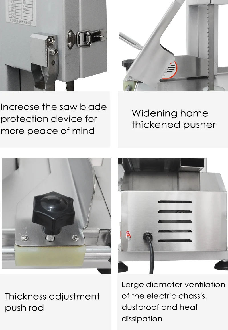 Multifunctional Electric Bone Sawing Machine Motor power: 650W Rated voltage: 220V Rated frequency: 50HZ Cutting thickness: 2-10CM Pulley diameter: 140MM Workbench: 47*32CM Product size: 47*42*78CM Weight: 38KG Product function: ribs, trotters, frozen meat