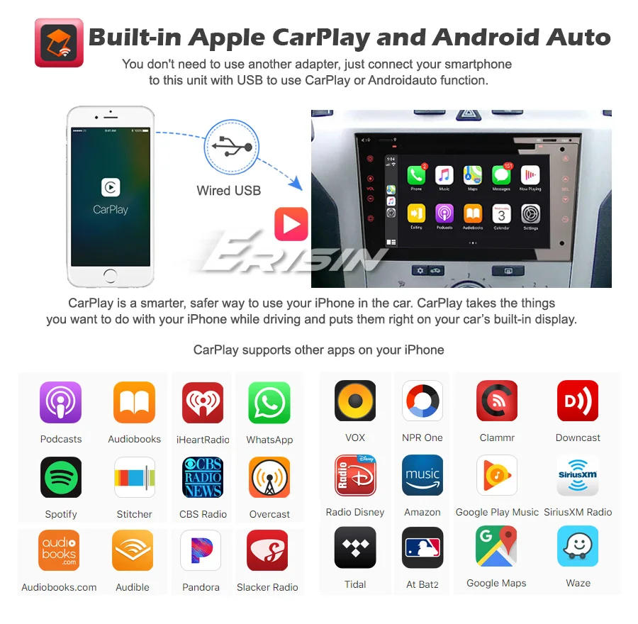 -Встроенный автоматический модуль Apple CarPlay и Android. Вам не нужно использовать другой адаптер, просто подключите