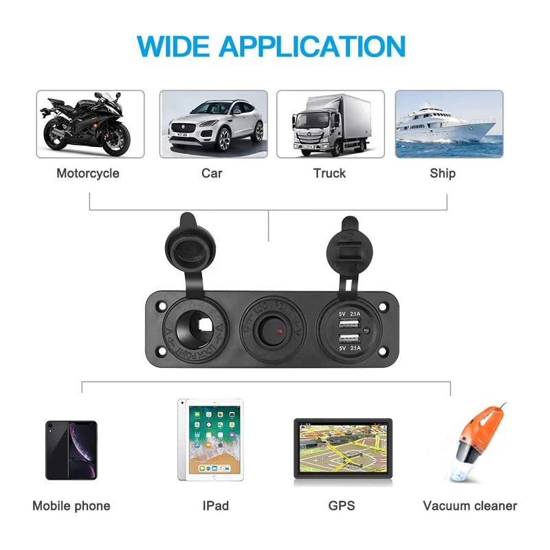 Этот гнездо прикуривателя подходит для 12-24 В автомобиля, лодки, морского транспорта, квадроцикла, RV и т. д. подходит для зарядки мобильных телефонов, GPS, цифровых камер, КПК и других USB-аксессуаров.