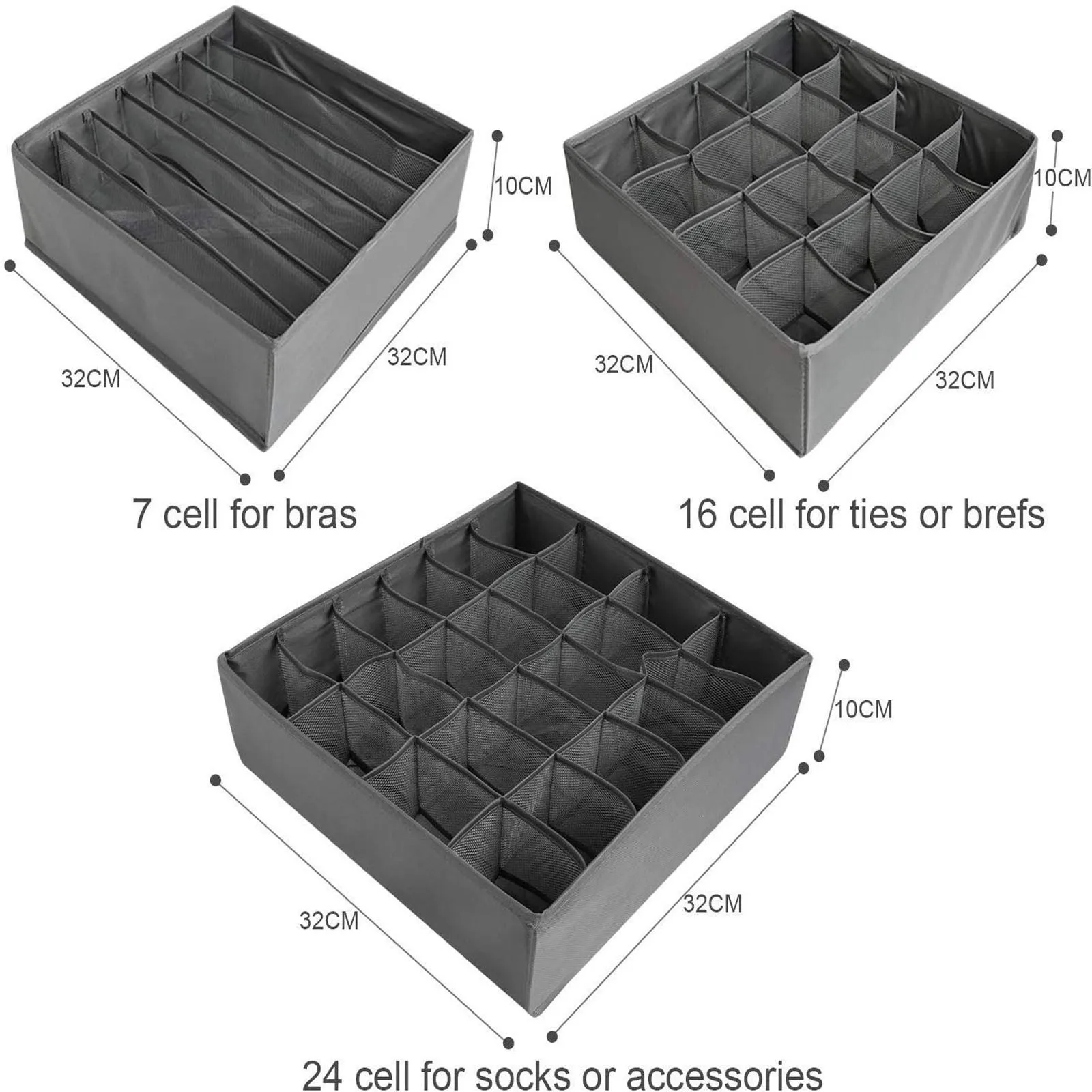 Экономия времени: Идеально подходит для организации нижнего белья, нижнего белья, трусов, бюстгальтеров, чулок, шарфов, галстуков. Легко найти тот, который вы хотите носить, и никогда не нужно рыться через всю вашу одежду. Уменьшить 50% времени одевания! Различные размеры и гибкость: 3 единицы пространства для хранения отвечает вашим различным потребностям Организации, мы предлагаем 7 ячеек для бюстгальтеров, 16 ячеек для галстуков или брюк, 24 ячейки для носков или других аксессуаров. В реальности вы можете использовать эти коробки для хранения всего, что вам нравится! Высококачественный Материал: изготовлен из прочной нетканой ткани и пластмассовых прорезей, чтобы сделать его более прочным, который является молевым, стойким к плесени, влагостойким и очень прочным. Складной и портативный: со съемными боковыми панелями и нижней застежкой-молнией вы можете легко организовать или сложить их, чтобы удобно хранить или носить с собой для тех, кто хочет держать вещи организованными даже во время путешествий.Посылка включает в себя:
