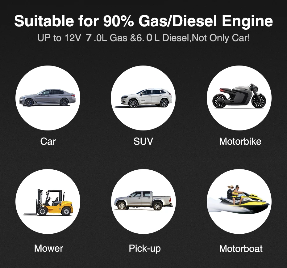 Jstar 3 может увеличить большинство транспортных средств, таких как автомобили, мотоциклы, водные средства, снегоходы, косилки, ATV / UTV и грузовики с газовыми двигателями размером до 7,0 л и дизельными двигателями размером до 6,0 л. Благодаря аккумулятору емкостью 20000 мА · ч, мощный аккумулятор может увеличивать среднюю мощность транспортного средства в 25 раз при одной зарядке. Он имеет 1600 Ампер пикового тока и поставляется с умными зажимами для безопасного соединения, которое эффективно повышает ваш автомобиль. Лучшее для дальнего вождения, приключений, улицы, повседневной чрезвычайной ситуации, путешествий и т. д.
