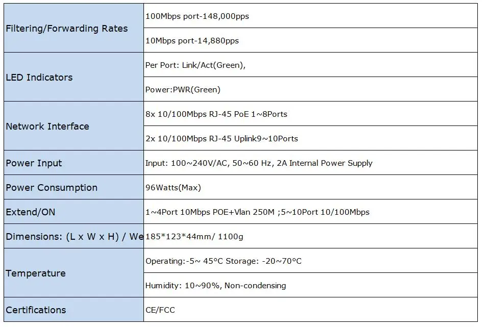 -Расширение переключателя, 1-4Port V-Lan on; 5E расстояние кабеля cat 250M; Скорость передачи данных 10 Мбит/с