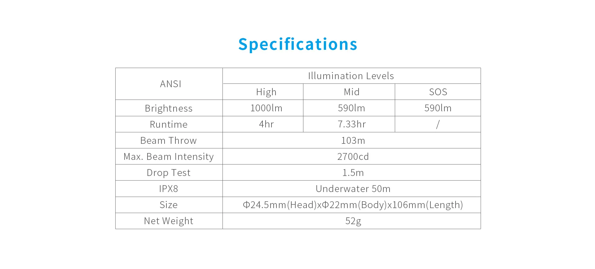 • Три режима освещения: высокий (1000lm) -средний (590lm) -SOS (590lm)