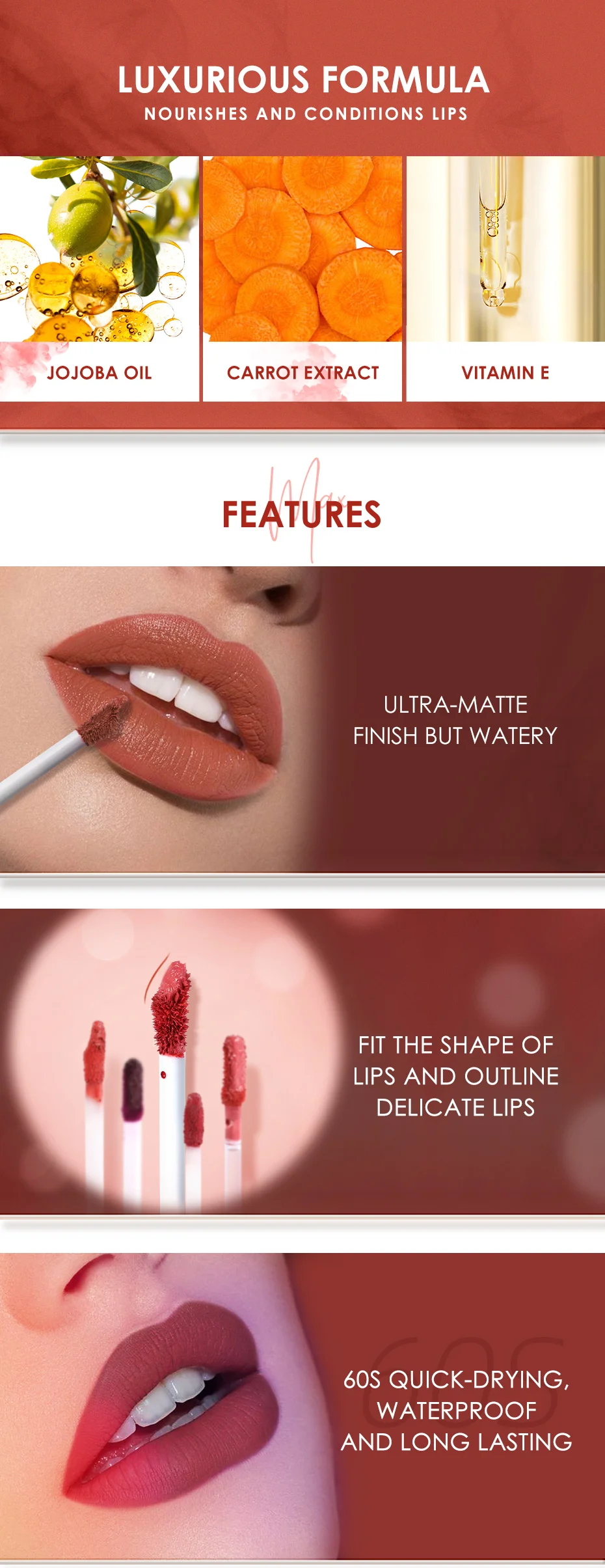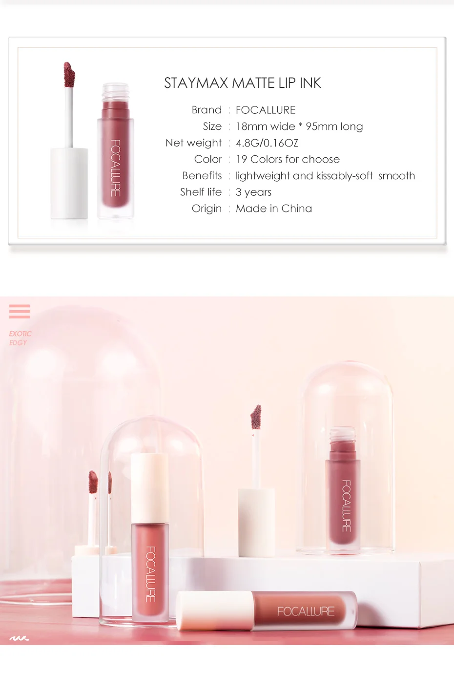 FOCALLURE новейший STAYMAX MATTE LIPINK скользит по губе в качестве Аква для целомудрия-мягкой гладкой с легкой формулой. С ультра-матовым покрытием, но не сухим. Longstay с высокой пигментированной в сборке и водонепроницаемости износа. Увлажняйте и питайте губы в течение всего дня с помощью масла семян жожоба, экстракта моркови и витамина Е. Встроенный изогнутый аппликатор с большей точностью подходит для губ.