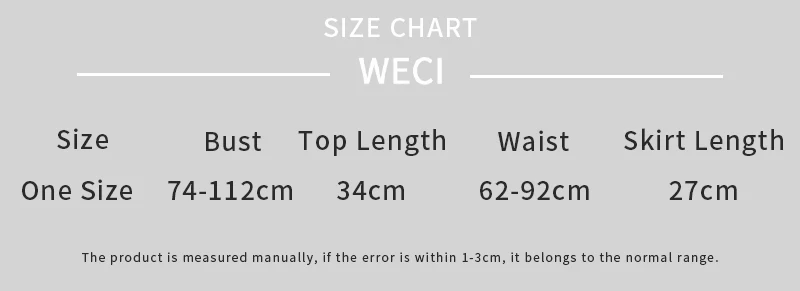 Один размер: обхват груди (74-112 см). Длина топа (34 см). Длина юбки (27 см). Обхват талии (62-92 см).