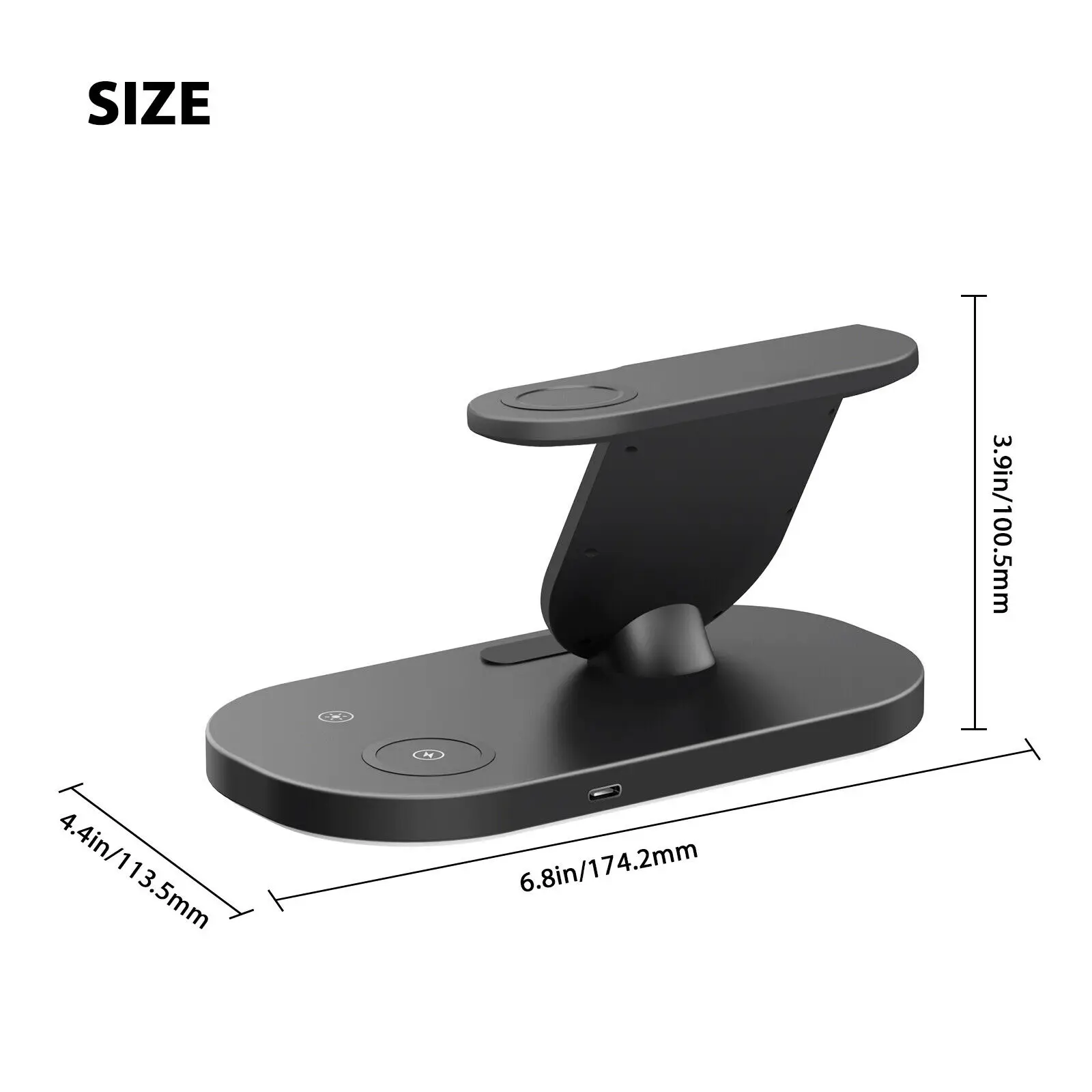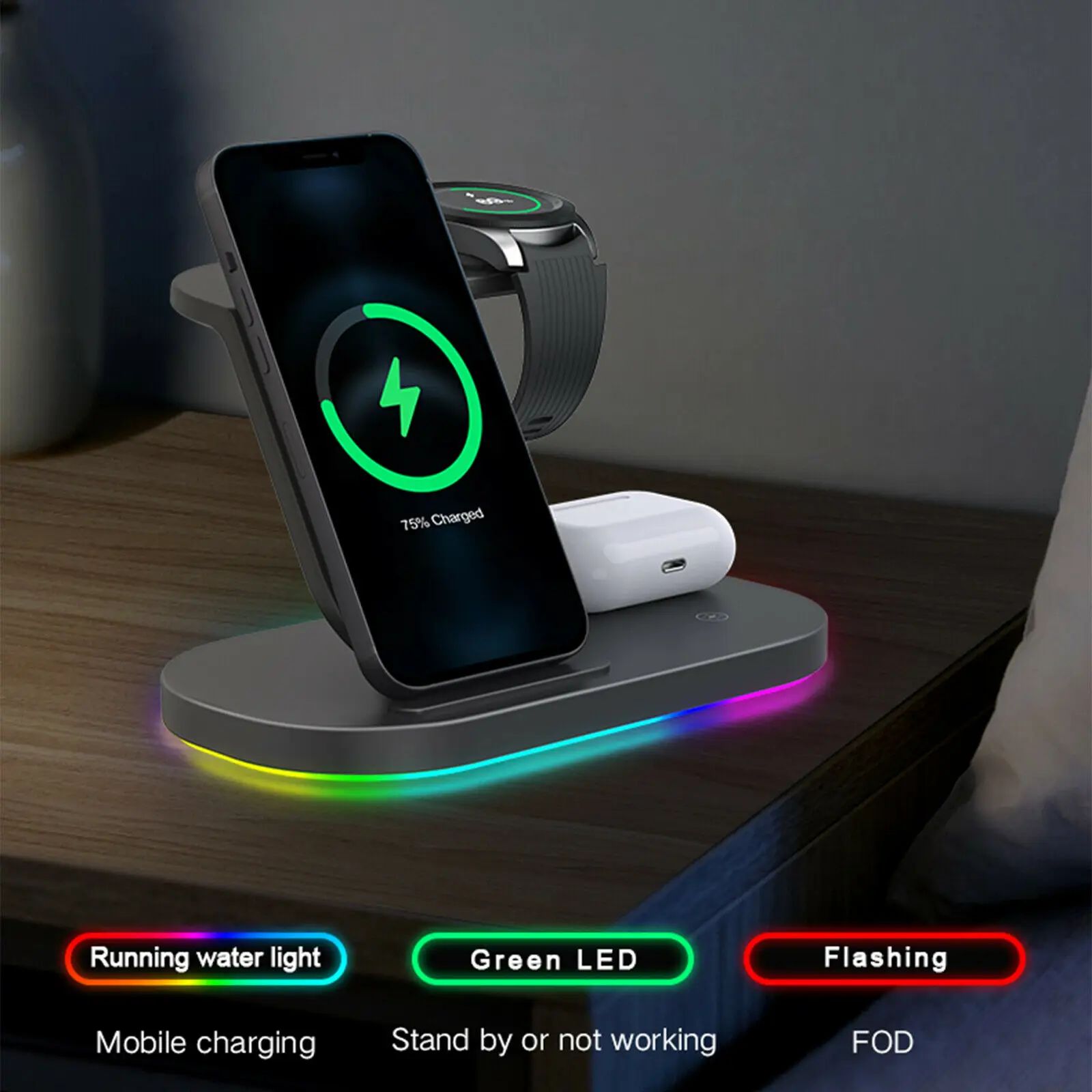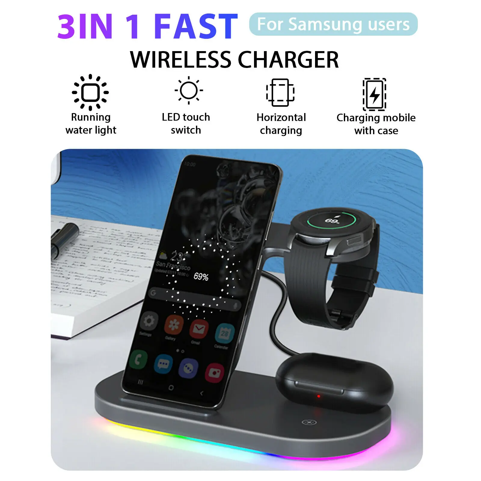 Характеристика продукта 3 в 1 Беспроводное зарядное устройство: беспроводное зарядное устройство может заряжать мобильный телефон, часы Samsung и Airpods. Подходит для Apple AirPods 1/2/AirPods Pro, galaxy Watch 3 и iPhone 12/12pro/11/11/XS Max / XS/XR/iPhone X / 8 / 8 Plus и Samsung GalaxyS20/10/S9/ S8, примечание 20 Note10 Note9 и многое другое. Для Samsung часы: (Выходная мощность: Макс 2,5 W / 5V / 0.5A.). Подходит для Galaxy Watch 3(2020),Galaxy Watch Active 1,Active 2,Gear s3.просто поместите устройство Galaxy Watch на беспроводное зарядное устройство, и оно будет заряжаться легко. Мульти-Защита: быстрая зарядка беспроводного зарядного устройства. С защитой от перегрузки по току, защитой от перенапряжения и защитой от перегрева, а также функцией обнаружения посторонних объектов, это может предотвратить чрезмерное повреждение батареи оборудования. Противоскользящая конструкция: Зарядная база с противоскользящим силиконовым дизайном, так что зарядное устройство не будет перемещаться или переворачиваться, чтобы обеспечить защиту вашего телефона при зарядке. Многофункциональность: специально разработанный с эргономичным углом обзора позволяет использовать экран телефона в портретном или ландшафтном режиме, идеально подходит для iPhone face ID, просмотра фильмов, текстовых сообщений, совершения телефонных звонков без рук, вы можете общаться в чате и делать что-либо еще в офисе или дома во время зарядки. Светодиодный светильник: меняющий Цвет светодиодный фонарик. Красиво и позволяет узнать, когда устройство готово к зарядке, зарядке и когда устройство полностью заряжено (есть сенсорный выключатель, который можно выключить) Примечание: адаптер QC 3,0 (9 в 2A, 9 В 2.7A или 12 В 2A) требуется для зарядки, в противном случае это может привести к прерывистой зарядке. Спецификация продукта