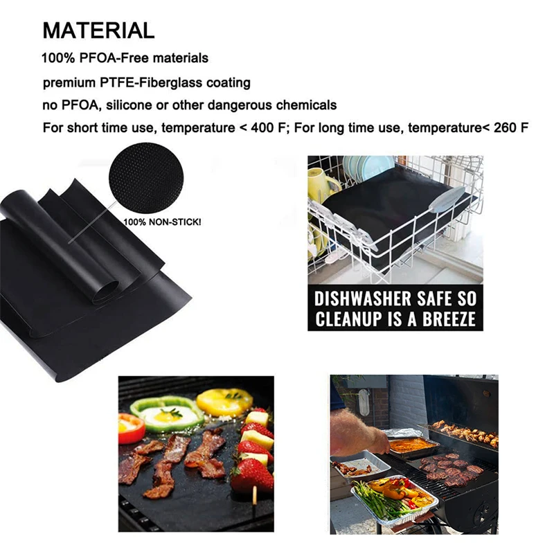 40*30 см антипригарные коврики для барбекю, сверхмощные, многоразовые и легко чистятся-работает на электрическом гриле, газовом угле, принадлежности для барбекю, коврик для гриля Особенности: 1. Антипригарная конструкция: Получите больше от гриля, чем просто приготовление мяса, используя эти антипригарные коврики для жарки, чтобы сделать гриль, рубленые овощи и даже яйца, бекон и блинчики. Они предотвращают попадание пищи через решетки, сохраняя при этом аромат барбекю. 2. Высокая термостойкость более 500 ℉: Изготовлен из высококачественного термостойкого стекловолокна PTFE, без пфок, силикона или других опасных химических веществ. Он может выдерживать 500 ℉ без горения или сжигания. Когда вы жарите коврик, пожалуйста, не прикасайтесь к коже. 3. Многоразовые: коврик для приготовления барбекю сидит на верхней части барбекю и предотвращает попадание жира и грязи по всему барбекю, сохраняя его в чистоте для следующего использования и экономя много времени на уборку. Коврики легко протираются, после очистки коврик оставляет нулевой запах. 4. Универсальные коврики для гриля для барбекю: Идеально подходит для любого барбекю, включая коккинг, Вебер, уголь, электрические печи и даже инфракрасный гриль, также можно разрезать на любую форму, которую вы хотите, это делает его более легким и вкусным для приготовления пищи. 5. Безопаснее и здоровее: когда наша еда запекается непосредственно над огнем, мясо быстро горит и подвержено вредным веществам. Наш гриль-коврик для барбекю изготовлен из безопасного материала, чтобы еда не была непосредственно жареной, оставаясь еще вкусной.