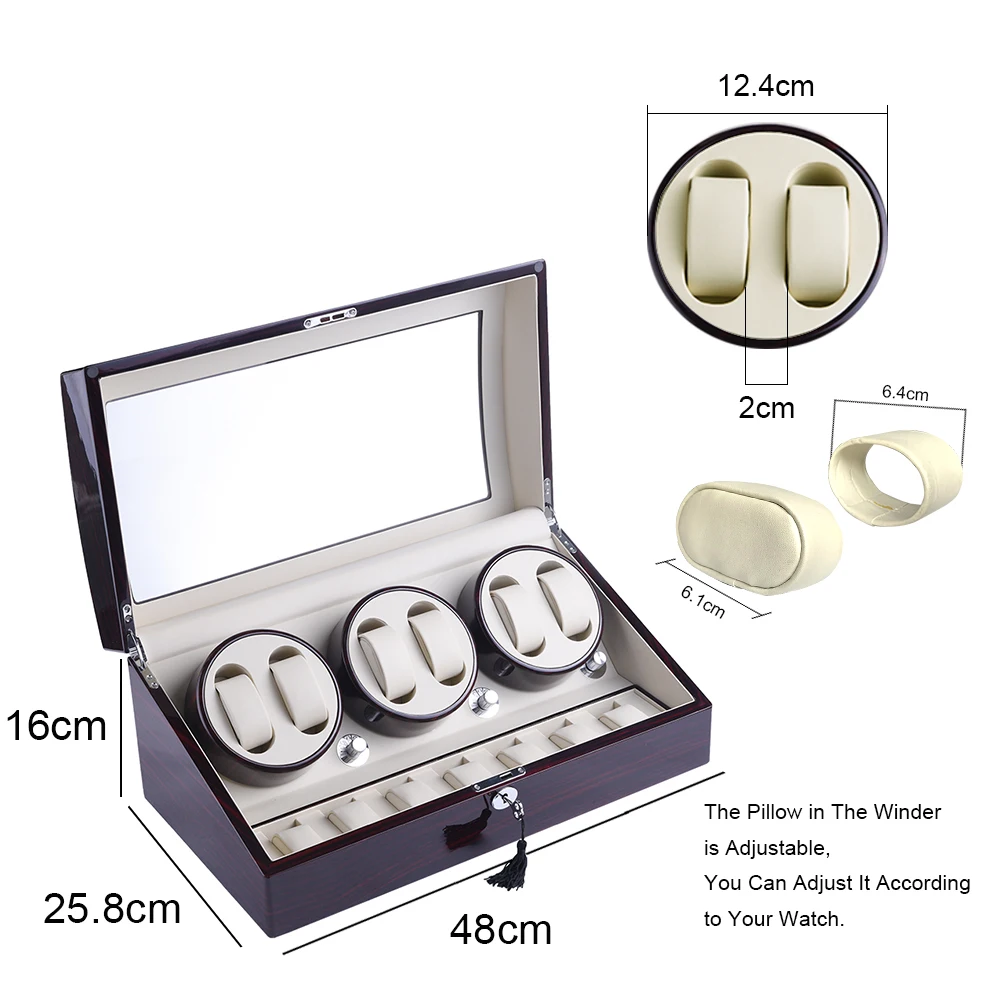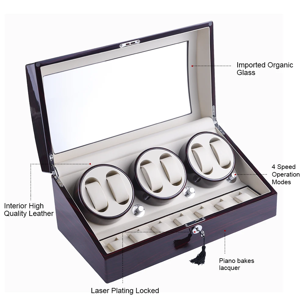 【High Quality Material】: This watch winders is 100% Handmade of natural wooden and high grade piano lacque, use PU interior, clear organic glass cover protects your watch dust free.