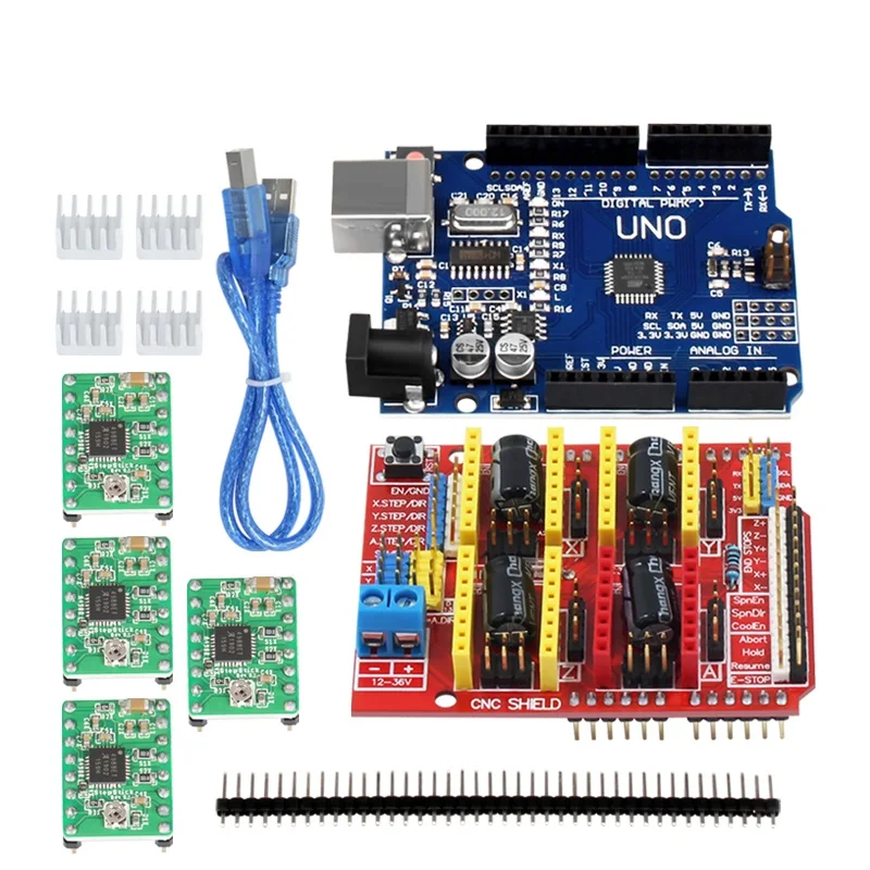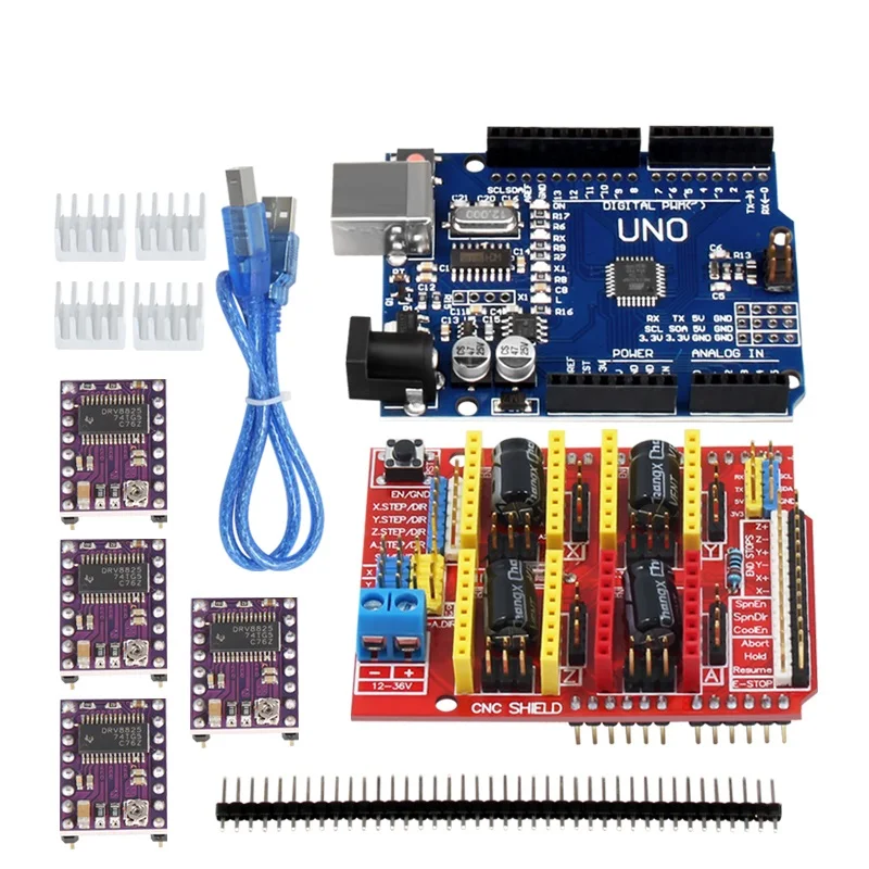Посылка включает в себя: 1 комплект/2 комплекта/3 комплекта.1 комплект:1 шт. UNO R3 CH340.1 шт. щит с ЧПУ для лазерной гравировки.1 шт. USB кабель.4 шт. A4988/DRV 8825 драйвер с теплоотводом (отдельные упаковки)