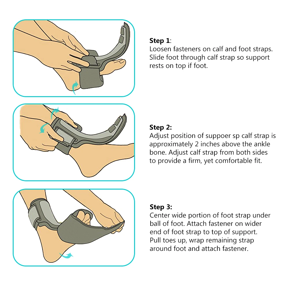 Шаг 1: ослабьте застежки на ремнях голени и стопы. Сползайте ногу через ремешок икры, так что поддержка держится сверху, если нога. Шаг 2: Отрегулируйте положение голени suppoer sp на 2 дюйма выше лодыжки. Отрегулируйте ремешок икры с обеих сторон, чтобы обеспечить прочную, но удобную посадку. Шаг 3: широкая часть ножного ремешка под шариком ноги. Прикрепите застежку на более широком конце ремешка стопы к верхней части поддержки. Потяните пальцы вверх, оберните оставшимися ремешками вокруг стопы и прикрепите застежку.