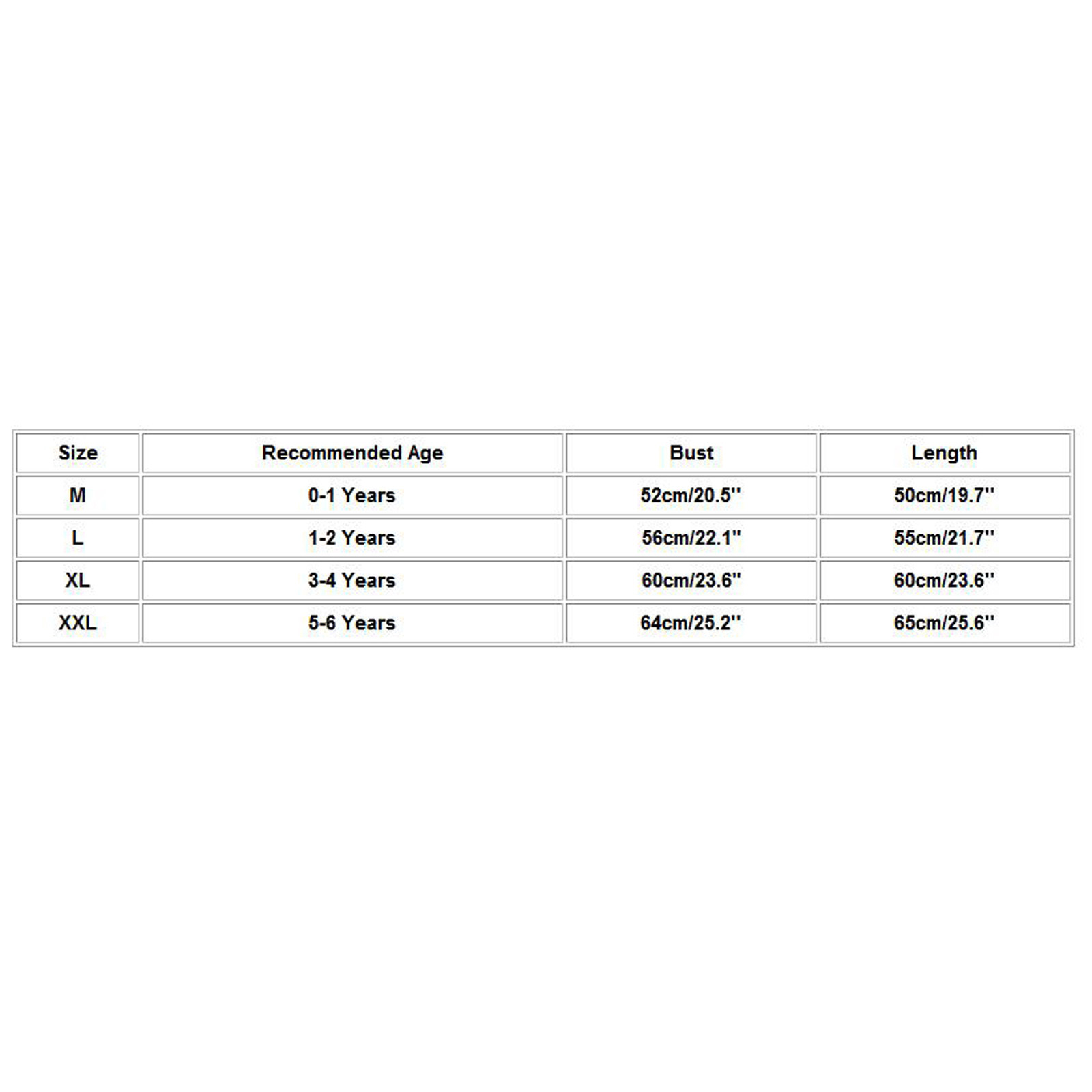 Размеры Рекомендуемый возраст Бюст Длина М От 0 до 1 года 52 см/20,5 дюйма 50 см/19,7 дюйма L Для детей от 1 до 2 лет 56 см/22,1 дюйма 55 см/21,7 дюйма XL От 3 до 4 лет 60 см/23,6 дюйма 60 см/23,6 дюйма XXL От 5 до 6 лет 64 см/25,2 дюйма 65 см/25,6 дюйма