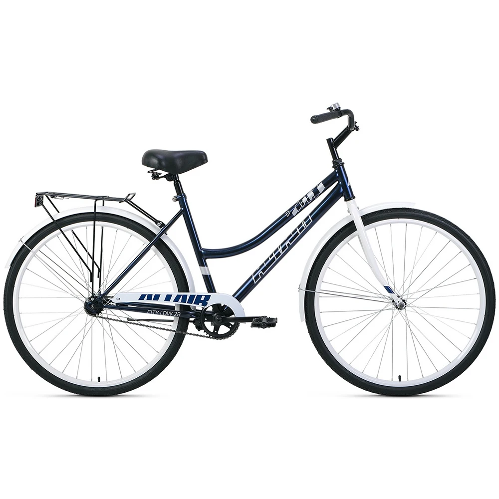Городской женский велосипед ALTAIR CITY low 28" модельного ряда 2021 года для комфортного передвижения в городской черте. Модель имеет заниженную раму из прочной стали типа Hi-Ten, 28-дюймовые колеса с шинами Wanda P1134, задний багажник и кожух, прикрывающий цепь и звездочку, жесткую стальную вилку и комфортное широкое седло. Дополнительно велосипед комплектуется громким звонком с креплением на руль и компактной убираемой подножкой.