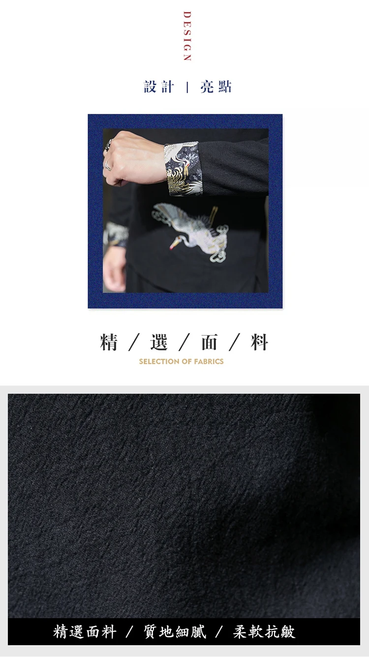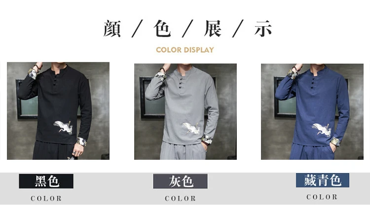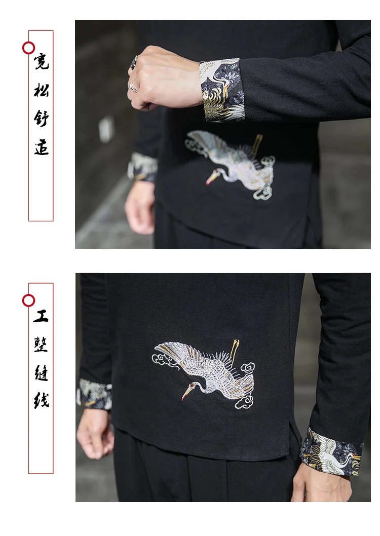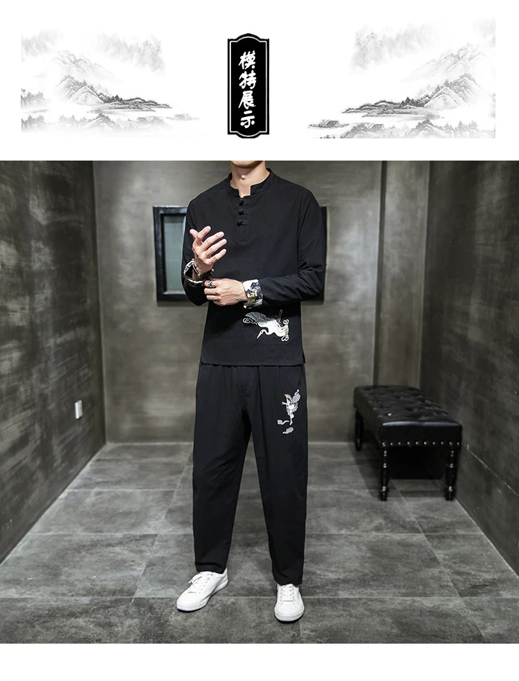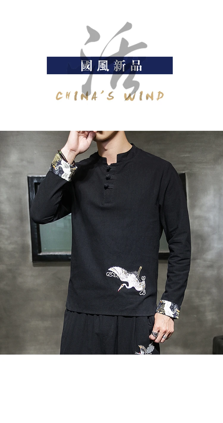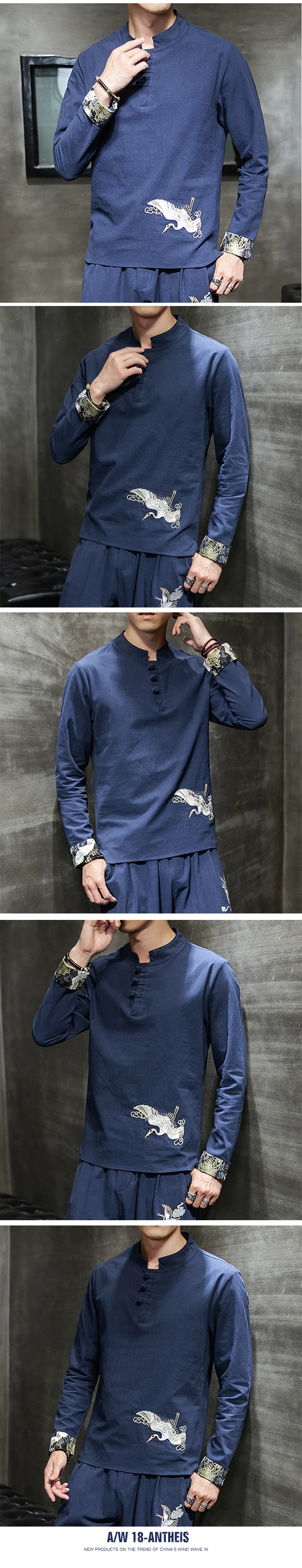 Мужская льняная винтажная льняная блузка в китайском стиле с вышивкой и пряжкой в стиле Мандарин кунг-фу, цвет черный, синий, Zhongshan Fu