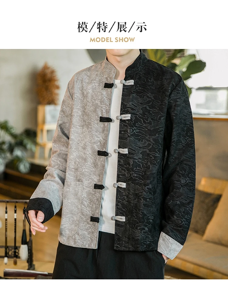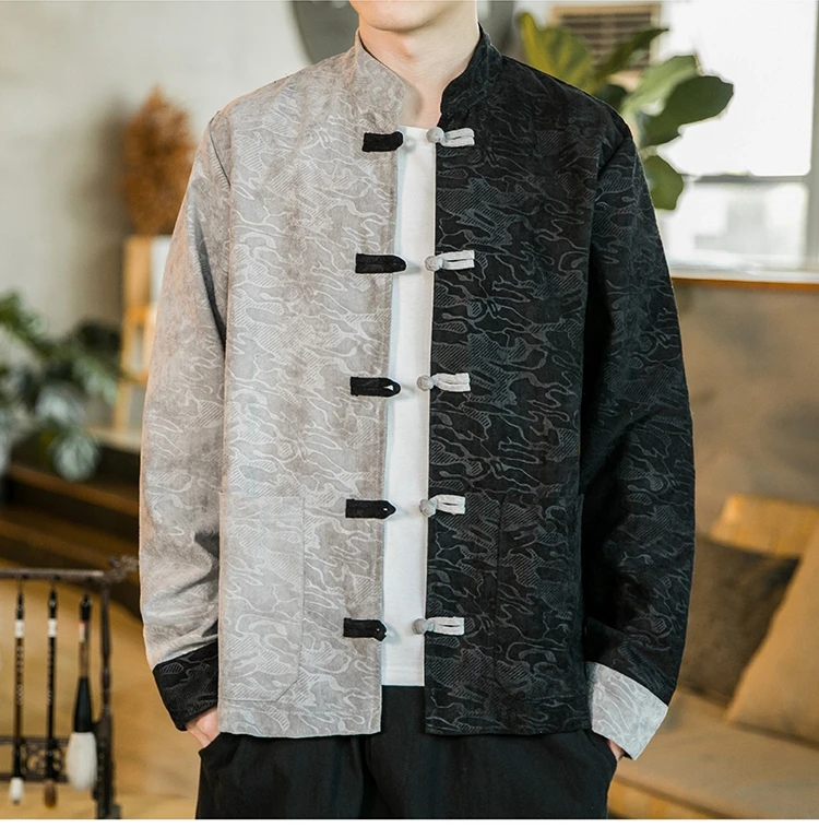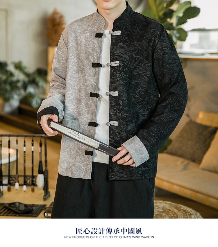 Пальто с цветным блоком и тиснением, традиционная китайская одежда для мужских курток, воротник-стойка, пряжка, костюм Тан, модные стильные пальто