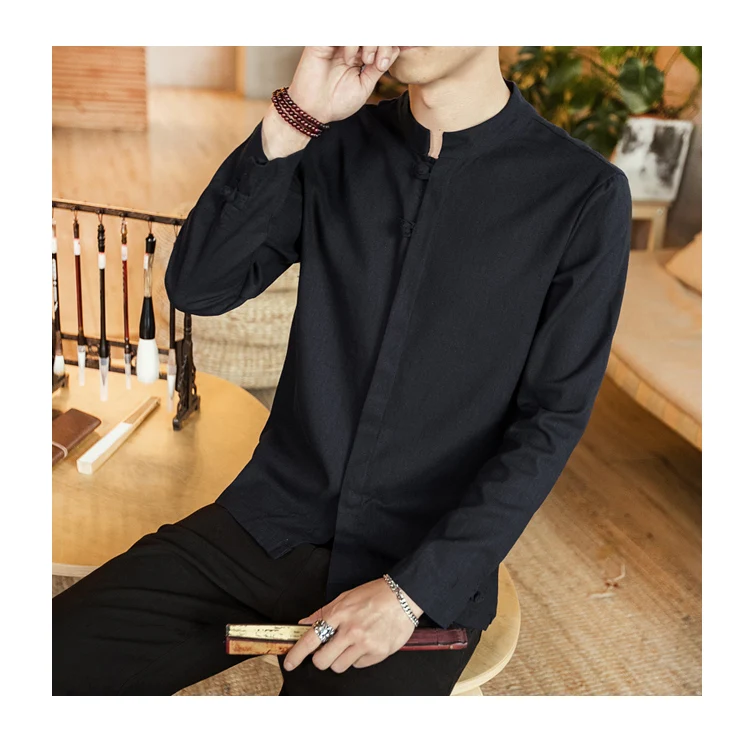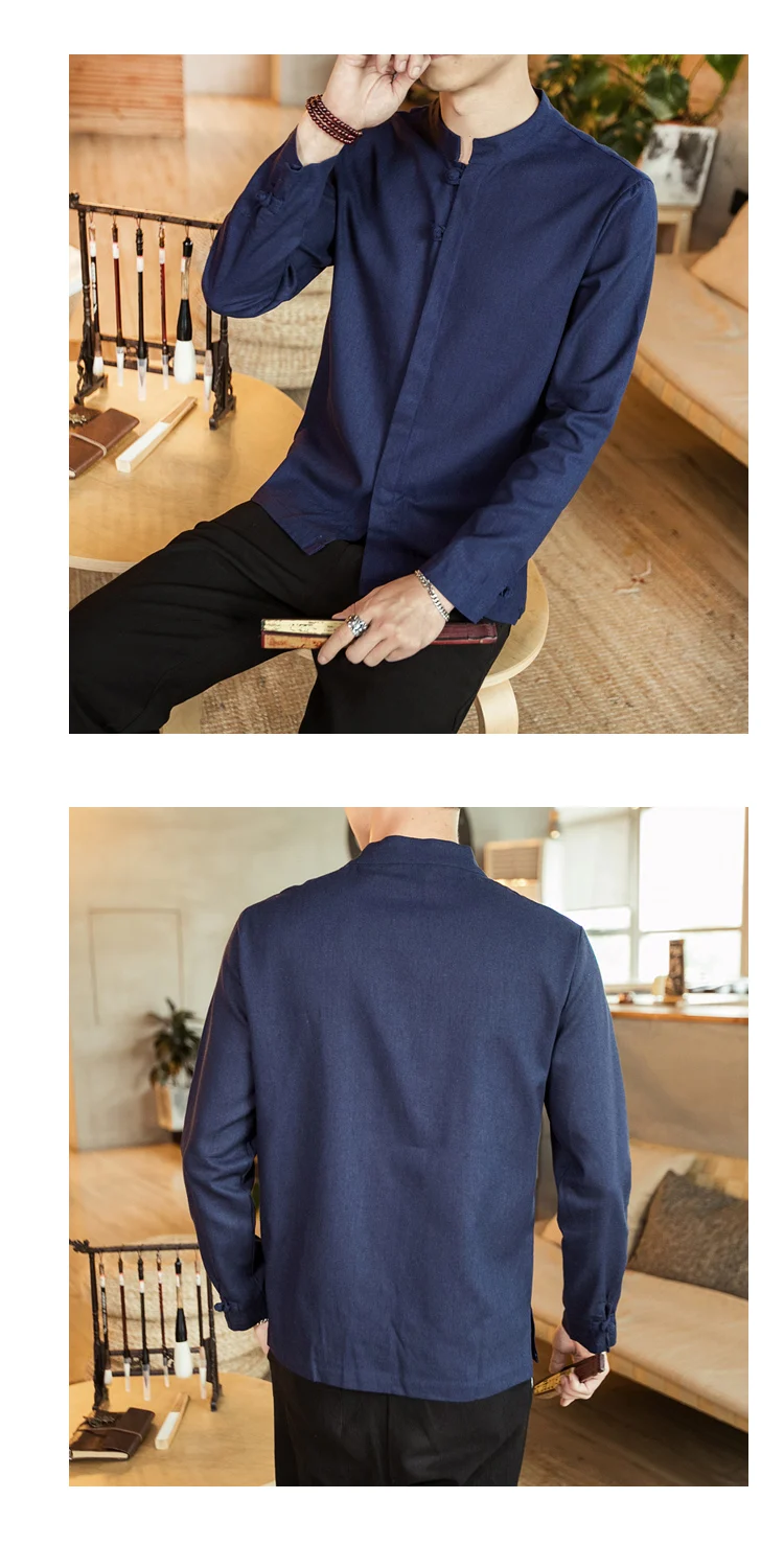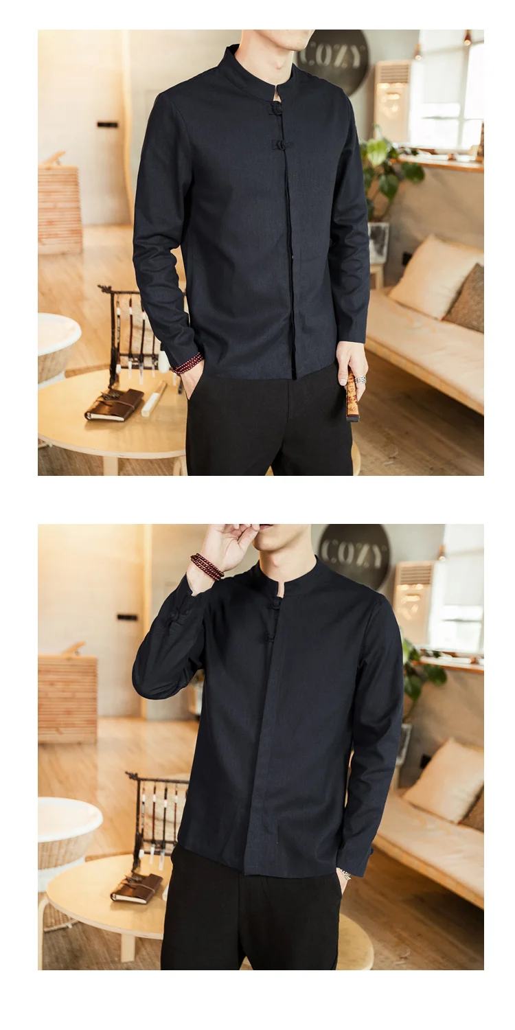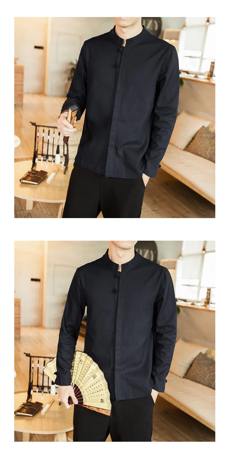 Хлопок и лен воротник Мандарин Тан костюмы мужская черная блузка в китайском стиле винтажная Этническая одежда Лен большой размер синяя рубашка с пряжкой