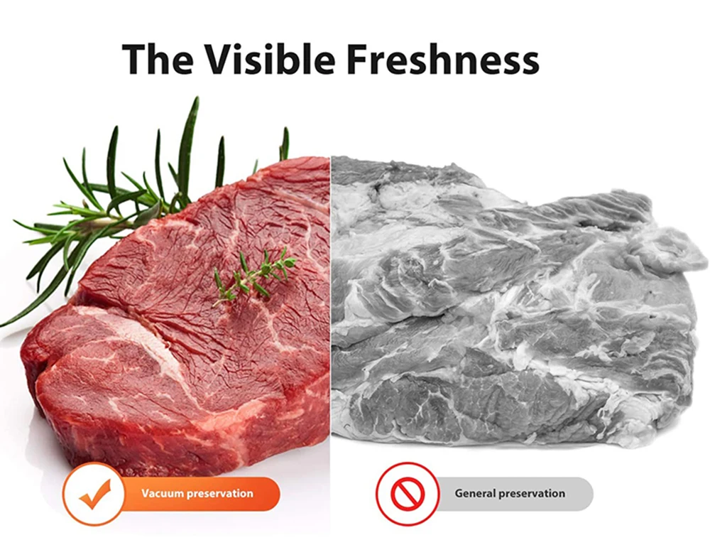 Этот вакуумный упаковщик Сохраняет ваше мясо, овощи и остатки свежих и ароматных, хранится в 5-7 раз дольше, чем традиционное охлаждение, замороженное хранение и нормальные условия.