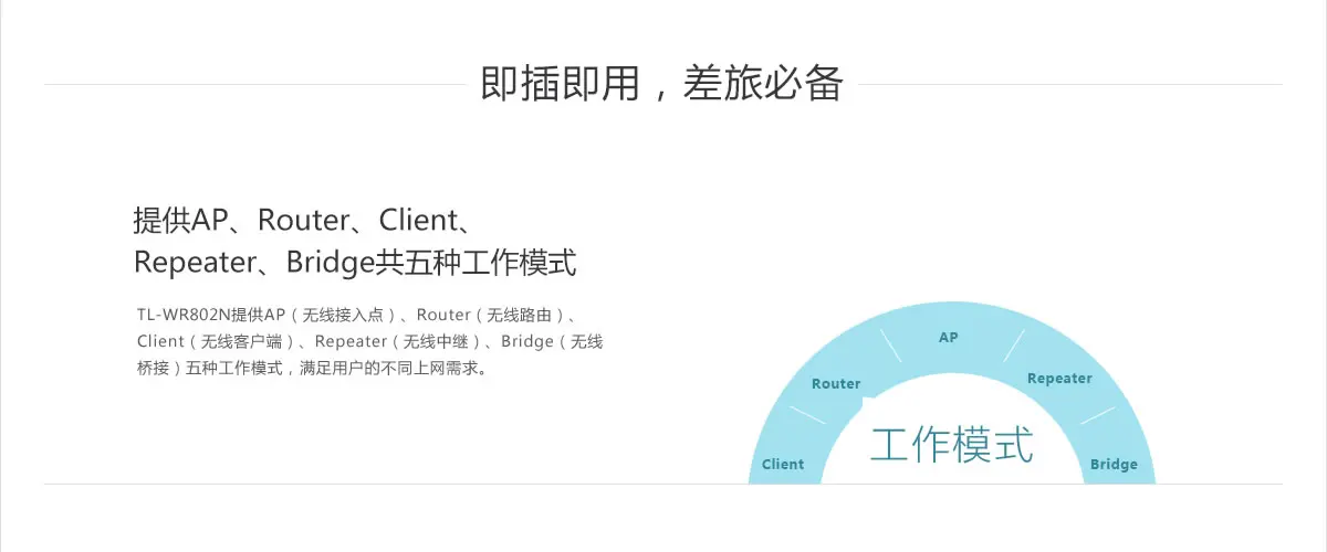 > Режим работы AP (точка беспроводного доступа); Режим клиента (беспроводной клиент); Режим повторителя (беспроводной повторитель); Режим моста (беспроводной мост); Режим маршрутизатора (беспроводной маршрутизатор).